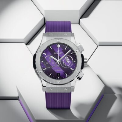 Paying tribute to the most popular Football League in the world, as its largest partner, Hublot created the Hublot Classic Fusion Chronograph Premier League men’s watch, 42 mm, reference 541.NX.8970.RX.PLW23 with the famous crowned Premier League lion at 3 o’clock.  This explosive model is rightfully a harmonious combination of classic and sporty style, creativity and traditional craftsmanship of the manufacturer, high strength and impeccable precision. This is a unique tribute to the king of the sport and the Premier League – one of the best football tournaments in the world. The watchcase is made of satin-brushed and polished titanium, renowned for its strength, lightness and scratch resistance. The bezel boss, located between the bezel and the case, is made of black composite resin.The elegant Matte Purple dial with polished rhodium-plated hands and applique-style applied index hour markers with a matte finish is instantly recognizable as Hublot. Thanks to the presence of a chronograph, which includes a large central seconds hand with the “H” logo as a counterweight and 30-minute counter located at 9 o’clock, this model can rightfully be called a high-end functional watch. The chronograph is adjusted using polished titanium pushers at the 2 and 4 o’clock positions. In addition, this model have small seconds dial located at the 3 o’clock position and a date indicator at the 6 o’clock position. Helping control the watch is a Pull / push crown engraved with the Hublot logo in Titanium with contoured grooves for improved grip. The dial closed by a Scratch-resistant Sapphire Crystal with Anti-reflective Treatment. The case back of the watch is also made of sapphire crystal, allowing you to observe the fantastic work of the watch movement. The traditional Hublot, but no less elegant Titanium bezel with a brushed top and polished beveled edge, secured with 6 immediately recognizable polished titanium screws in the shape of the letter “H”. The flawless operation of the watch is ensured by the HUB1153 Self-winding Chronograph Movement, which contains 35 jewels and has an approximate power reserve of 42 hours. This model is presented on an elegant and comfortable Purple lined rubber Strap with Stainless Steel Deployant Buckle Clasp. Water resistance is up to 50m/165ft (5 ATM).