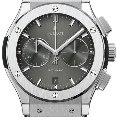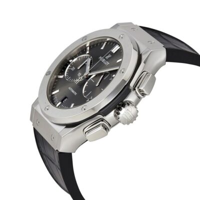 Hublot Classic Fusion Racing Grey Chronograph Titanium 45mm watch. Polished titanium case with brushed finished top and bottom center links between the lugs, Reference 521.NX.7071.LR. This model has Satin-finished Gray Sunray dial with a contrasting metallic silvered sub-dials. Polished, rhodium-plated hands indicate the time. Applied brushed finish Stainless Steel “applique” style index hour markers. Minute markers around the outer rim. Small-seconds sub-dial located at the 3 o’clock position. Chronograph/Stopwatch function: large central seconds counter with the “H” logo as a counter-weight; 30-minute sub-dial counter located at the 9 o’clock position. Polished titanium chronograph buttons. Date window located the 6 o’clock positions. Polished titanium crown with Pull / Press function. On it, the Hublot logo engraved on it. The dial closed by a Scratch-resistant Sapphire Crystal with Anti-reflective Treatment. Of Sapphire Crystal made transparent case back. The watch is equipped fixed titanium bezel with brushed finished top and polished finished beveled edges, secured with 6 polished “H” style Titanium screws. Black composite resin “bezel lug” sandwiched between the bezel and case. The watch is self-winding mechanical Hublot Caliber HUB1143, contains 59 Jewels and has an approximate power reserve of 42 hours. This model presented on a Gray Alligator/Crocodile Leather Strap with Lining of Black rubber stiched with Stainless Steel Deployant Buckle Clasp. The water resistance is up to 50m/150ft (5 ATM).