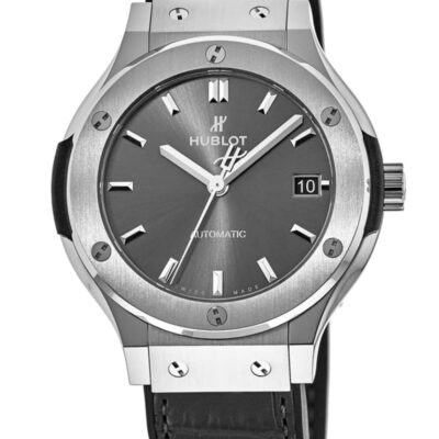 Hublot Classic Fusion Racing Grey Titanium 38mm watch. Grey polished Titanium case with brushed finished top and bottom center links between the lugs, Reference 565.NX.7071.LR. This model has Satin-finished Gray Sunray dial with applied polished index hour markers and rhodium plated hands. Date window located the 3 o’clock positions. Polished titanium crown, Pull/push function and engraved with the Hublot logo. The dial closed by a Scratch-resistant Sapphire Crystal with Anti-reflective Treatment. Of Sapphire Crystal, transparent case back made. The watch is equipped fixed Satin-finished Titanium bezel polished finished beveled edge, secured with 6 polished “H” style Titanium screws. Black composite resin “bezel lug” sandwiched between the bezel and case. The watch is self-winding mechanical Hublot Caliber HUB1110, contains 21 Jewels and has an approximate power reserve of 42 hours. This model presented on grey alligator leather strap with Push Button Folding Clasp. The water resistance is up to 50m/150ft (5 ATM).