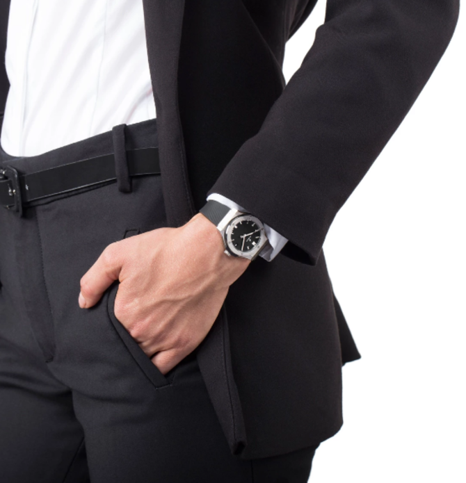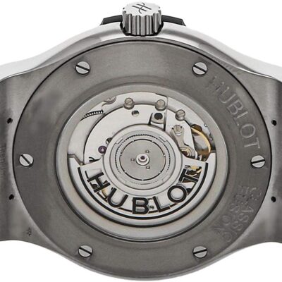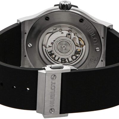 Hublot Classic Fusion Titanium 45mm watch. Polished titanium case with brushed finished top and bottom center links between the lugs, Reference 511.NX.1171.RX. This model has flat matte black lacquered dial with applied brushed finished titanium toned “applique” style index hour markers and polished rhodium plated hands. Date window located the 3 o’clock positions. Solid polished titanium screw-down crown engraved with the Hublot logo. The dial closed by a Scratch-resistant Sapphire Crystal with Anti-reflective Treatment. Of Sapphire Crystal, transparent case back made. The watch is equipped fixed titanium bezel, with a brushed finished top and polished finished beveled edge, secured with 6 polished “H” style titanium screws. Black composite resin “bezel lug” sandwiched between the bezel and case. The watch is self-winding mechanical Hublot Caliber HUB1112, contains 25 Jewels and has an approximate power reserve of 42 hours. This model presented on Black liner rubber strap with Stainless Steel Deployant Buckle Clasp. The water resistance is up to 50m/150ft (5 ATM).