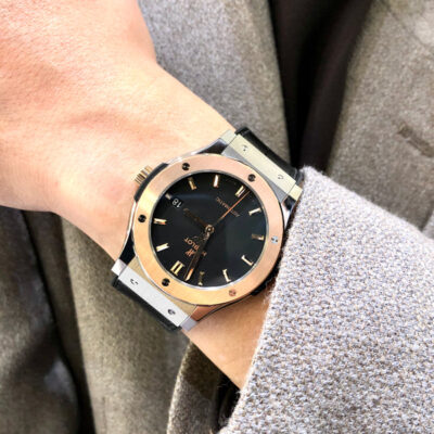 Hublot Classic Fusion Titanium King Gold 45mm watch. Polished titanium case with brushed finished top and bottom center links between the lugs, Reference 511.NO.1181.LR. This model has flat matte black lacquered dial with applied brushed finished King Gold toned “applique” style index hour markers and polished King Gold plated hands. Date window located the 3 o’clock positions. Solid polished 18kt King Gold crown Pull / Press function and engraved with the Hublot logo. The dial closed by a Scratch-resistant Sapphire Crystal with Anti-reflective Treatment. Of Sapphire Crystal, transparent case back made. The watch is equipped fixed Solid 18kt King Gold bezel, with a brushed finished top and polished finished beveled edge, secured with 6 polished “H” style titanium screws. Black composite resin “bezel lug” sandwiched between the bezel and case. The watch is self-winding mechanical Hublot Caliber HUB1112, contains 21 Jewels and has an approximate power reserve of 42 hours. This model presented on Black rubber strap with a stiched Black Alligator/Crocodile Leather Strap with Stainless Steel Deployant Buckle Clasp. The water resistance is up to 50m/150ft (5 ATM).
