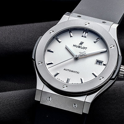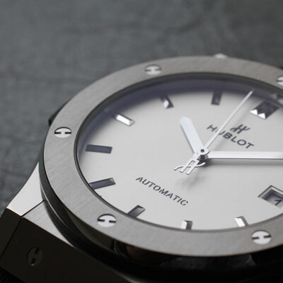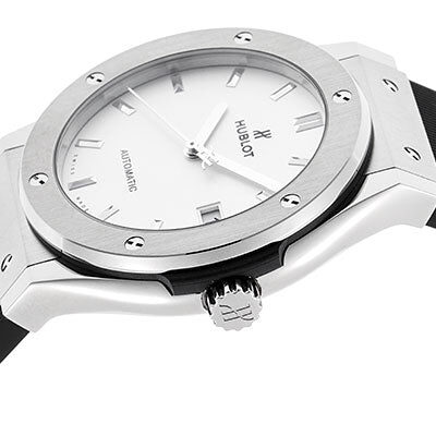 Hublot Classic Fusion Titanium 45mm watch. Polished titanium case with brushed finished top and bottom center links between the lugs, Reference 511.NX.2611.RX. This model has Flat matte silver “Opaline” dial with applied brushed finished titanium toned “applique” style index hour markers and polished rhodium plated hands. Date window located the 3 o’clock positions. Solid polished titanium screw-down crown engraved with the Hublot logo. The dial closed by a Scratch-resistant Sapphire Crystal with Anti-reflective Treatment. Of Sapphire Crystal, transparent case back made. The watch is equipped fixed titanium bezel, with a brushed finished top and polished finished beveled edge, secured with 6 polished “H” style titanium screws. Black composite resin “bezel lug” sandwiched between the bezel and case. The watch is self-winding mechanical Hublot Caliber HUB1112, contains 21 Jewels and has an approximate power reserve of 42 hours. This model presented on Black liner rubber strap with Stainless Steel Deployant Buckle Clasp. The water resistance is up to 50m/150ft (5 ATM).