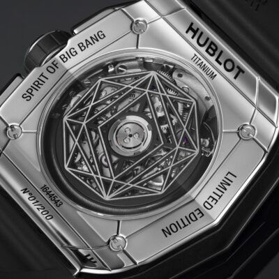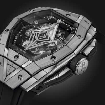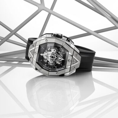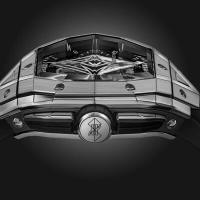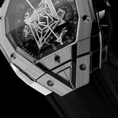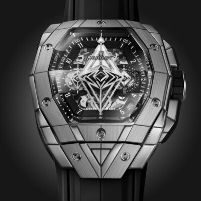 Unworn man’s watch Hublot, Spirit of Big Bang Sang Bleu Titanium, 42mm, Ref# 648.NX.0107.RX.MXM23. The new 2023 product from Hublot has delighted fans of the work of Maxime Plescia-Buchi, who translates the language of his geometric tattoos into an explosive 3D sculptural composition of futuristic watches. A stunning combination of three-dimensional geometric shapes in black ceramic gives the barrel-shaped case a new identity: the elongated bezel and case form a striking diamond structure – Buchi’s signature geometric shape. It consists of many individual geometric parts – hexagons, diamonds and triangles – skillfully combined into a single piece. In addition to the 3D effect, the faceted components rise, fall, are highlighted by vertical matte finishes, and polished surfaces. The complex design of the case is fully matched by a sapphire crystal dial with a skeletonized signature Buchi diamond structure in the center: a large diamond-shaped hand with Super-LumiNova indicates the hours, and a smaller one indicates the minutes. The dodecagonal sapphire crystal has a minute track with Arabic numerals every 5 minutes, and towards the center, there is a black 10-sided track with hour markers printed in Arabic numerals. The chronograph includes a thin, large central seconds hand, as well as two subdials with diamond-shaped hands (as far as hands can be called) showing a small seconds at 9 o’clock and a 30-minute chronograph counter at 3 o’clock. He is controlled by polished titanium pushers at the 2 and 4 o’clock positions. A window between the 4 and 5 o’clock positions shows the date. The polished titanium crown has an engraved Hublot logo and a rubber shock absorber with grooves for better grip. The anti-reflective sapphire crystal that covers the dial is equally sculptural. It not only provides protection, but also creates increased volume and optical distortion. The back cover is also made of sapphire glass, which makes it possible to see the details of the mechanism with your own eyes and adds a touch of originality. The real highlight of the watch is the complex elongated bezel made of Satin-finished and Polished Titanium, secured with 6 immediately recognizable titanium “H” screws with the Hublots signature inscription. The flawless operation of the watch is ensured by the HUB4700 Self-winding Skeleton Chronograph Movement, which contains 31 jewels and has an approximate power reserve of 50 hours. This model is presented on an elegant and comfortable Black Smooth Rubber Strap and Black Ceramic and Black-plated Titanium Deployant Buckle Clasp. Water resistance is up to 100m/330ft (10 ATM).