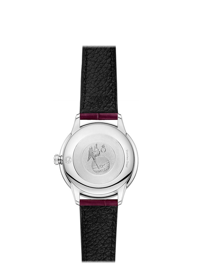 Unworn Omega De Ville PRESTIGE QUARTZ 434.13.28.60.61.001. 27.5 mm, Red dial, Steel case, Steel bezel, OMEGA 4061 calibre, Quartz Movement, 48 months power reserve, Leather strap with Pin buckle clasp. Water resistant to 30 m.