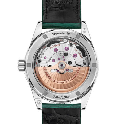 Unworn Omega Seamaster 300 CO‑AXIAL MASTER CHRONOMETER 234.93.41.21.99.001. 41 mm, Green dial, Platinum case, Ceramic bezel, 8913 calibre, Self Winding Movement, 60 hours power reserve, Leather strap with Foldover clasp. Water resistant to 300 m.