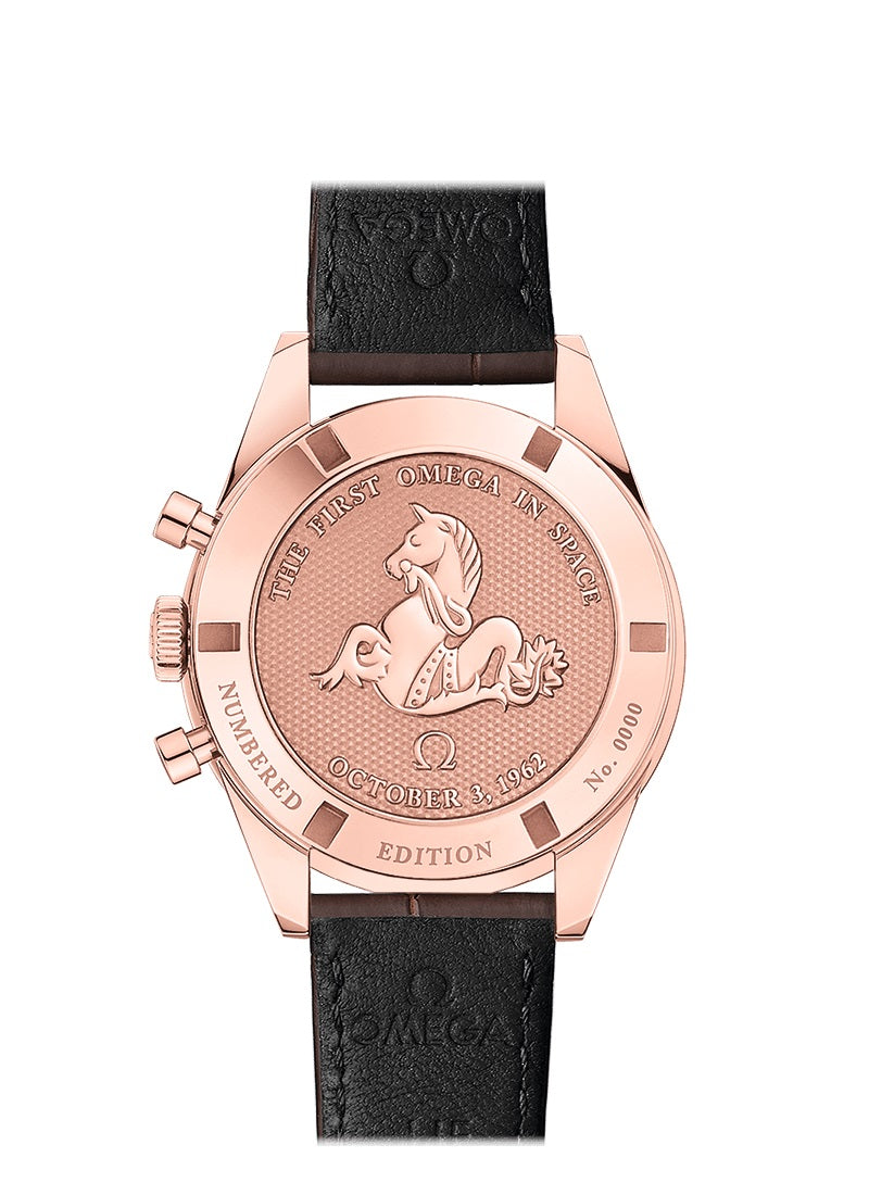 Unworn Omega Speedmaster ANNIVERSARY SERIES CHRONOGRAPH 311.63.40.30.02.001. 39.7 mm, Opaline silvery dial, Sedna™ gold case, Brown polished ceramic bezel ring and a matt chromium nitride tachymeter scale, 1861 calibre, Manual winding Movement, 18 jewels, 48 hour power reserve, Brown leather strap with Buckle clasp. Water resistant to 50 m.