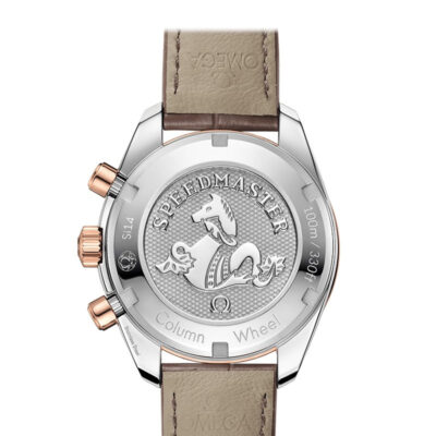 Unworn Omega Speedmaster CO‑AXIAL CHRONOMETER CHRONOGRAPH 324.28.38.50.02.002. 38 mm, Brown dial, Steel case, Sedna™ Gold bezel, 3330 calibre, Automatic Movement, 52 hour power reserve, Leather strap Foldover clasp. Water resistant to 100 m.