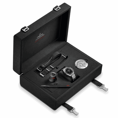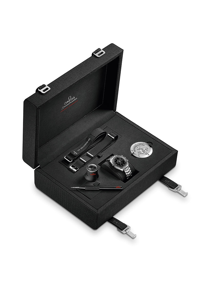 At the heart of this chronograph is OMEGA’s mechanical calibre 1863, a descendent of the legendary manual-winding movement worn on the Moon, visible through the transparent caseback. This timepiece is offered with a special Moonwatch presentation box which contains a “NATO” strap, a strap for astronauts, a tool to change the bracelet and a book highlighting Speedmaster’s adventures.