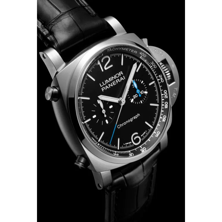 Unworn Panerai Luminor Chrono PAM01109. 44 mm, Black dial, AISI 316L brushed steel case, Polished Steel bezel, P.9200 calibre, Automatic mechanical Movement, 41 jewels, 42 hours power reserve, Alligator Black straps. Water resistant to 100 m.
