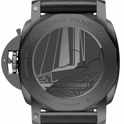 Unworn Men’s Watch Panerai Luminor Luna Rossa GMT – 44mm, of black DLC titanium case, Reference PAM01036. The model has Dark grey sail dial with polished black hands with luminous fill. This watch is engraved hour markers in a combination of Arabic Numerals in the 6, 9, and 12 o’clock positions and indexes with luminous fill. Small seconds sub-dial located at the 9 o’clock position, with bold luminous 15 seconds markers. A small red luminous leaf-shaped hand is used for the small seconds sub-register. This Officine Panerai signature element speaks innovation and seamless function. Date window located 3 o’clock position. The dial closed by a Scratch-resistant Sapphire Crystal. The watch has Panerai’s (protected as a trademark) instantly recognizable crown protector of Black DLC titanium and screw down Pull/push crown DLC titanium with a ribbed edge for a comfortable grip. They have case shape Round and a Solid case back in titanium with black coating and Engraved. The watch is equipped fixed Black DLC titanium bezel. The Model comes with Automatic mechanical movement Panerai Caliber P.9010/GMT contains 31 Jewels and has an approximate power reserve of 72 hours. The watch presented on a Black Calf Ponte Vecchio strap with secured by a black DLC-coated titanium large-sized Tang Buckle. The water resistance is up to 300m/1000ft.