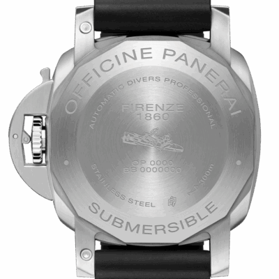 Unworn Men’s Watch Panerai Submersible – 42mm, of AISI 316L brushed steel case, Reference PAM00973. The model has Black dial with luminous Index hour markers at 6 and 12 o’clock positions and rest of the hour markers in the form of large dots with luminescent filling. This watch is bold the iconic large silver-tone skeleton sword-shaped different hands of polished steel with bold blue luminescent fill. Date window located 3 o’clock position. Also watch has one-small second subdial at 9 o’clock with luminous blued steel hand, with marked in bold luminous dots and indexes across every 15 minutes. This Officine Panerai signature element speaks innovation and seamless function. The dial closed by a Scratch-resistant Sapphire Crystal. The watch has Panerai’s (protected as a trademark) instantly recognizable crown protector and screws down the crown of polished steel with a ribbed edge for a comfortable grip. They have case shape Cushion and solid case back of brushed steel made. The watch is equipped anti-clockwise rotating bezel of brushed steel with a graduated 15-minute scale. It also has raised points at 5-minute intervals, marked separately for 15, 30 and 45 minutes, and a large luminous point at the origin. The Model comes with Panerai Caliber P.900 automatic movement, containing 23 Jewels and has a power reserve of approximately 72 hours. The watch presented on a black rubber strap secured by a Tang buckle. The water resistance is up to 300m/1000ft.