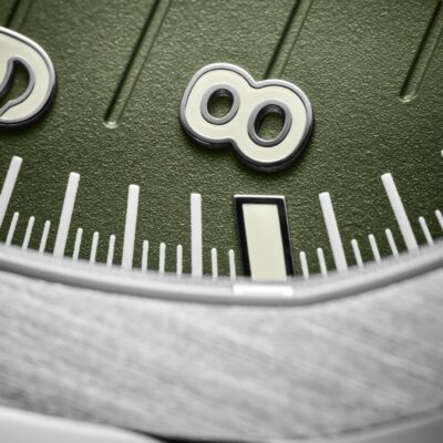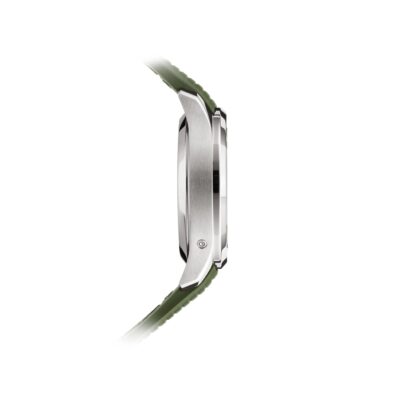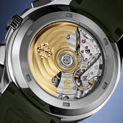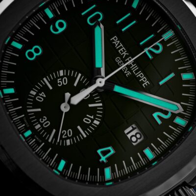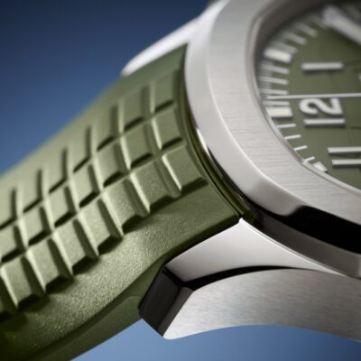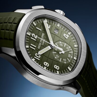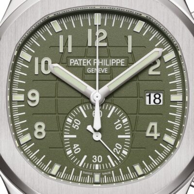 New Patek Philippe Aquanaut Chronograph luxury sports watch, 42,2mm, 18k White Gold, Ref. 5968G-010. The first chronograph with a flyback function in the modern Aquanaut sports collection, which perfectly matches the character of this young and dynamic watch line. His 18k White Gold rounded, pillow-like octagon-shaped case and gently curved ears are unmistakable. On a beautiful Khaki green dial with embossed embossing, perfectly readable large applied polished Arabic numerals made of 18k White Gold with luminescent coating in the form of hour markers look harmoniously. The manufacturer paid special attention to the second track on the outer rim of the dial. She is applied in long and short silvery lines with fairly wide luminous marks located every 5 minutes. Large polished luminous hour and minute hands in 18k White Gold indicate the time. These are complemented by a slim and elegant chronograph second hand (Sweep seconds hand). At the 6 o’clock position, there is a recessed green auxiliary chronograph counter with reverse movement repeating which follows the rounded octagonal shape of the bezel. It has glowing white Arabic numerals, white markers, and a white indicator needle. The date window is traditionally at the 3 o’clock position. Rectangular 18k White Gold buttons located on the right side of the case control the chronograph. At the 8 o’clock, position on the case is an instant date corrector. A polished 18k White Gold screw-down crown with a ribbed edge for a comfortable grip and the Patek Philippe logo is the finishing touch to the perfect picture. The dial is covered with a scratch-resistant sapphire crystal. The screw-down case back is also made of sapphire crystal, which allows you to see the magical work of the movement. Against this backdrop, a flat, fixed bezel in 18k White Gold, vertically ground on the front and polished on the sides, provides a wide view of the dial. The finish on the side of the bezel is amazing because at first glance, it looks rounded, but upon closer inspection, you can see the crisp edges playing with the light. The model is equipped with a Patek Philippe caliber CH 28‑520 C with a self-winding mechanical movement containing 32 jewels and a power reserve of min. 45 hours – max. 55 hours. This beautiful sport chic watch is presented on a Khaki green tropical rubber strap. This new composite material is highly resistant to wear, salt water and UV radiation. The strap are fastens with Patek Philippe’s patented 18k White Gold folding clasp, polished and engraved with the Calatrava cross. Opening the clasp reveals the engraved Patek Philippe logo with the word GENEVE. Water resistant up to 120m/394ft (12 ATM).