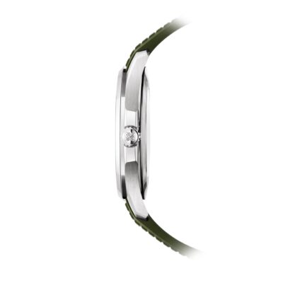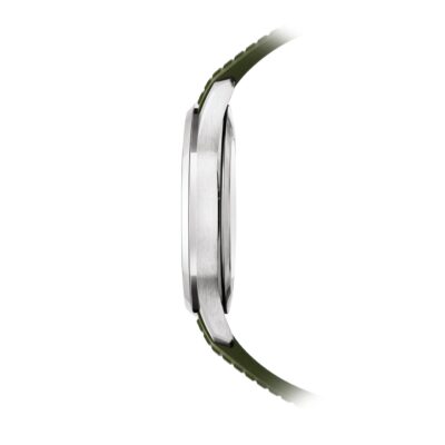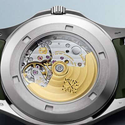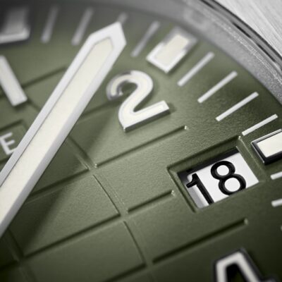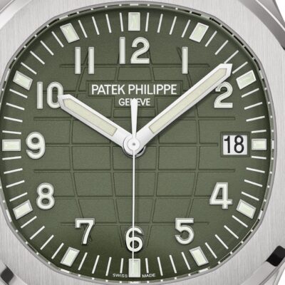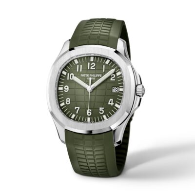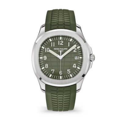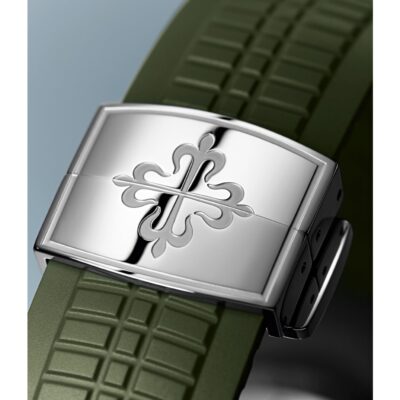 New Patek Philippe Aquanaut Jumbo Date Sweep Seconds luxury sports watch, 42.2 mm, 18k White Gold, Ref. 5168G-010. They are reliable and practical, modern and somewhat unexpected, inspired by Nautilus. Their 18k White Gold case features a rounded, cushion-shaped octagon that is unmistakable. It has polished crown guards protruding from the right side of the watchcase to protect her. The beautiful embossed Khaki green dial is one tone lighter than the strap, which has the same geosphere pattern. This color combination of dial and strap is the main attraction of this model. Perfectly readable large applied polished Arabic numerals made of 18k White Gold with luminescent coating in the form of hour markers look harmoniously. On the outer rim of the dial, a silver second track is printed with fairly wide luminous marks located every 5 minutes. The time is indicated by large polished 18k White Gold luminescent rod-shaped hour and minute hands, as well as a thin and elegant Sweep Seconds hand. The aperture date indicator is traditionally located at the 3 o’clock position. A polished 18k White Gold screw-down crown with a ribbed edge for a comfortable grip and the Patek Philippe logo is the finishing touch to the perfect picture. The dial is covered with a scratch-resistant sapphire crystal. The case back is also made of sapphire crystal, which allows you to see the magical work of the movement. Against this backdrop, a flat, fixed bezel in 18k White Gold, vertically ground on the front and polished on the sides, provides a wide view of the dial. The finish on the side of the bezel is amazing because at first glance, it looks rounded, but upon closer inspection, you can see the crisp edges playing with the light. The model is equipped with a Patek Philippe caliber 26‑330 S C with a self-winding mechanical movement containing 30 jewels and a power reserve of min. 35 hours – max. 45 hours. This beautiful sport chic watch is presented on a Khaki Green tropical rubber strap, made from a new composite material that is ultra-resistant to wear, salt water and UV radiation. It fastens with Patek Philippe’s patented 18k White Gold folding clasp, polished and engraved with the Calatrava cross. Opening the clasp reveals the engraved Patek Philippe logo with the word GENEVE. Water resistant up to 120 m/394ft (12 ATM).
