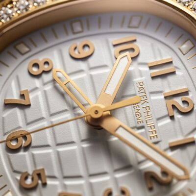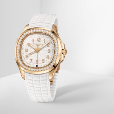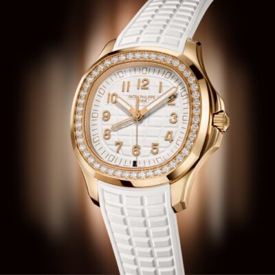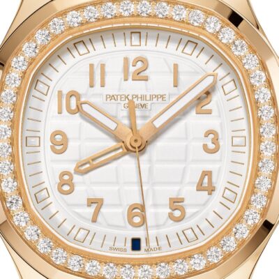 New Patek Philippe Aquanaut Luce Travel Time luxury Ladies watch, with a larger diameter 38,8mm, 18k Rose Gold, Ref. 5269/200R-001. The complex quartz wristwatch in the modern Aquanaut sports collection, which perfectly matches this character of young and dynamic watch line. The rounded octagonal 18k Rose Gold body and gently curved lugs, with polished flat surfaces and satin-finish sides are unmistakable. On a magnificent Matte white dial with embossed “Aquanaut” harmoniously looks perfectly readable large applied polished Arabic numerals made of 18k Rose Gold in the form of hour markers. The manufacturer paid special attention to the second track on the outer rim of the dial, on which applied rose gold tones lines with fairly wide luminous marks located every 5 minutes. Large polished luminous hour and minute hands in 18k Rose Gold indicate the time guarantee perfect readability even in the dark. These are complemented by a slim and elegant 18k Rose Gold second hand (Sweep seconds hand). In addition, this model has an additional skeleton hand, which indicates the time of the second time zone. Its setting is quite simple and is done using the crown. Moving forward one click, it sets the local time in increments of one hour forward or backward. Two clicks set the time and stop the movement. At the 6 o’clock, position there is an aperture for indicating the day and night of the home time zone. A polished 18k Rose Gold screw-down crown with inconspicuous and practical adjustment system with a ribbed edge for a comfortable grip and the Patek Philippe logo is the finishing touch to the perfect picture. The dial is covered with a scratch-resistant sapphire crystal. The screw-down Solid case back is made of 18k Rose Gold. The elegant highlight of this model is the fixed sparkling 18k rose gold bezel set with 48 Top Wesselton Pure round diamonds (~1.11 carats) flawless. The polishing on the sides impresses with classic precision. It also looks amazing because at first glance it looks rounded, but on closer inspection you can see the crisp edges playing with the light. The model is equipped with a Patek Philippe caliber E 23‑250 S FUS 24H with a Quartz movement. This beautiful sport chic watch is presented on an Integrated Matt-white strap that continues the visual harmony of the design made of Composite material. He is highly resistant to wear, salt water and UV radiation. The strap are fastens with Patek Philippe’s patented 18k Rose Gold folding clasp, polished and engraved with the Calatrava cross. Opening the clasp reveals the engraved Patek Philippe logo with the word GENEVE. Water resistant up to 60m/200ft (6 ATM).