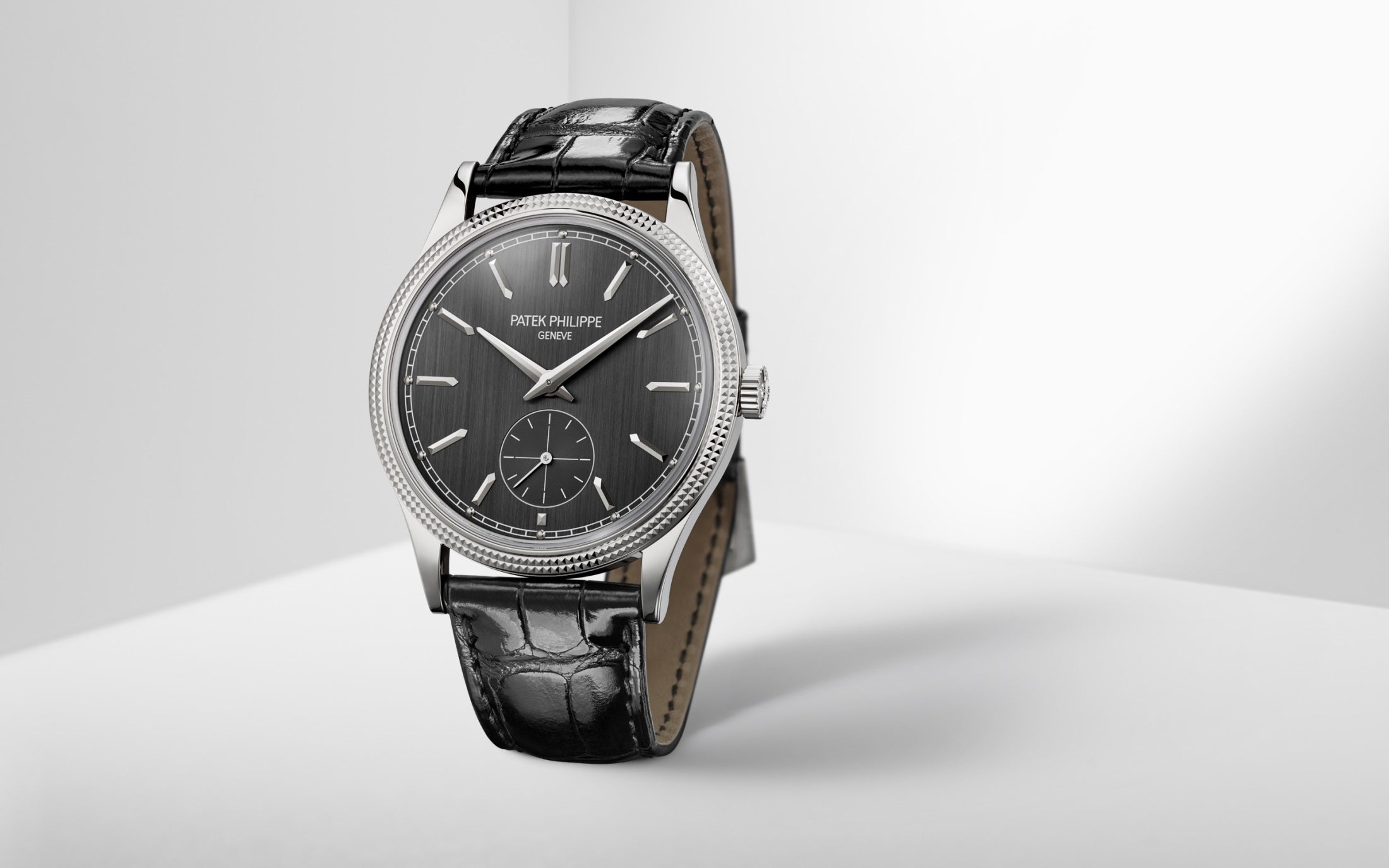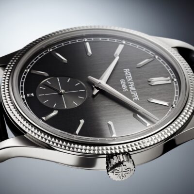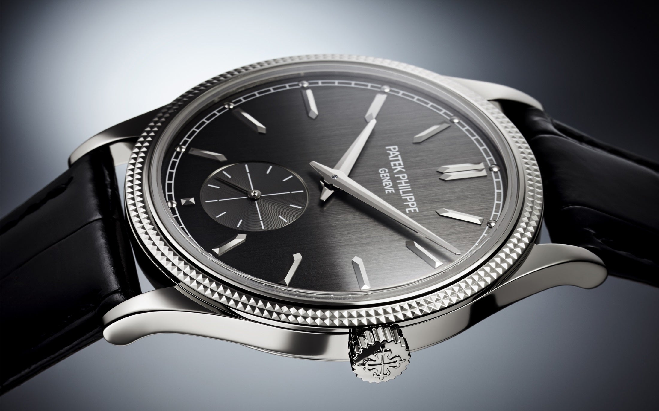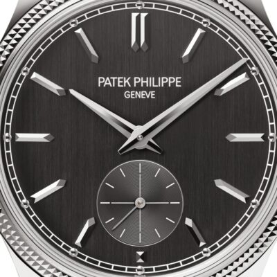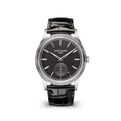 Luxury Patek Philippe Calatrava, 18k White Gold, 39mm and Reference 6119G-001. Their distinguishing feature is a charcoal grey dial with a vertical satin finish. Applied 18k White Gold faceted hour markers in the shape of boats and hour markers with 18k White Gold dots on a white minute scale around the perimeter in a railway style look stylish on it. The dauphin sword-shaped hour and minute hands in 18K White Gold, as well as the recessed gray small sub-dial with a permanent second hand with white markers and a gold indicator hand, are spectacular. A polished 18k White Gold Screw-down crown with a ribbed edge for easy grip and the Patek Philippe logo is located on the right side of the case. The dial closed by a Scratch-resistant Sapphire Crystal and sapphire-crystal case back which allows of the case, allows you to see the magical work of the movement. The watch features the recognizable polished downward-turning lugs and the bezel fixed in 18K White Gold with a guilloche “Clous de Paris” pattern in the form of double-row stepped jagged nails. The watch Patek Philippe Caliber 30‑255 PS mechanical manually wound movement, containing 27 Jewels, and has a power reserve of 65 hours. This model, presented on is on shiny black Alligator leather strap with square scales and hand-stitched. It zips up 18k White Gold Prong buckle. The water resistance is up to 30m/100ft (3 ATM).