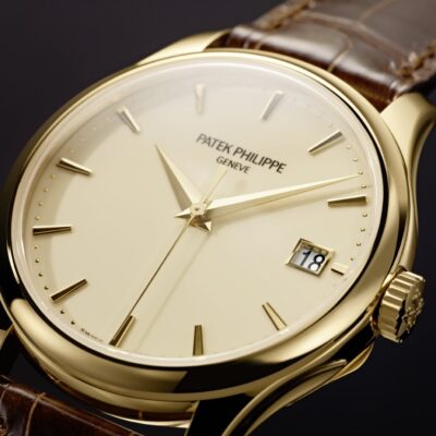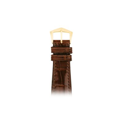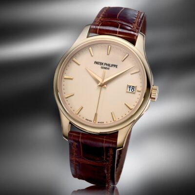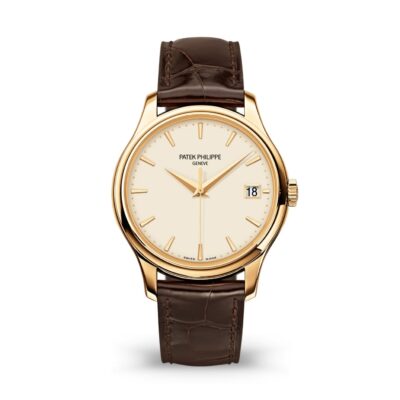 Luxury Patek Philippe Calatrava polished 18k Yellow Gold, 39mm, Reference 5227J-001 sleek lines and sophisticated elegance. The minimalistic lacquered ivory dial is classic in style and perfect for business attire. On him looks spectacular applied trapeze shaped indexes hour markers, polished 18k Yellow Gold dauphine-style hands and 18k Yellow Gold Dot minute markers around the outer rim. In addition, this model is equipped with a spectacular Center sweep second hand and an aperture-type date at the 3 o’clock position. A polished 18k Yellow Gold Push/pull crown with a ribbed edge for easy grip and the Patek Philippe logo is located on the right side of the case. The dial closed by a Scratch-resistant Sapphire Crystal. Sapphire-crystal too case back, which allows of the case, allows you to see the magical work of the movement with protected by an invisibly hinged dust cover. The watch features an 18k Yellow Gold fixed polished smooth bezel. This model has caliber Patek Philippe Caliber 324 S C, a self-winding mechanical movement containing 29 Jewels, with a power reserve of min. 35 hours – max. 45 hours. She is presented is on shiny chocolate brown Alligator/Crocodile leather strap with square scales, hand-stitched and an 18k Yellow Gold Prong buckle. The water resistance is up to 30m/100ft (3 ATM).