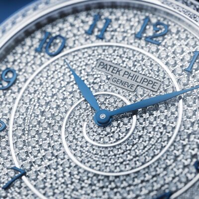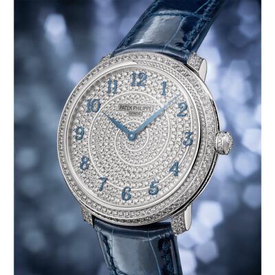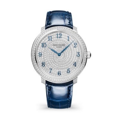 Luxury Ladies Watch Patek Philippe Calatrava Diamond Ribbon Joaillerie, 18kt White Gold, 36,5mm, Reference 4978/400G-001 – Sleek lines and sophisticated elegance combined with meticulous craftsmanship make this timepiece timeless sophistication. The Diamond Ribbon Joaillerie features a very elegant case fully encrusted with diamonds. The beauty of the watch is that Patek Philippe decorates with diamonds even the slanted edge that connects the bezel to the case back. The dial is adorned with a diamond swirl, reminiscent of the spinning ribbons of gymnasts, framed in white gold, which gives the watch a playful touch. To complete the breathtaking design, Patek Philippe opted for blued 18k White Gold leaf-shaped hands, and applied large blued 18k White Gold Arabic numeral hour markers.  For the case and dial, 679 graduated diamonds were used, forming a spiral: ~3.99 carats and for the lugs 48 diamonds: ~0.17 ct. A polished 18kt White Gold Screw-down crown with 16 diamonds: ~0.03 ct. and the Patek Philippe logo is located on the right side of the case. The dial closed by a Scratch-resistant Sapphire Crystal. Sapphire-crystal too case back, which allows of the case, allows you to see the magical work of the movement. The watch features fixed bezel from an 18kt White Gold set with diamonds. This model has caliber Patek Philippe Caliber 240, an Ultra-thin self-winding mechanical movement containing 27 Jewels, with a power reserve of 48 hours. She is presented is on shiny dusk blue Alligator/Crocodile leather strap with square scales, hand-stitched and a striking 18kt White Gold prong buckle with 27 diamonds: ~0.21 ct. The water resistance is up to 30m/100ft (3 ATM).