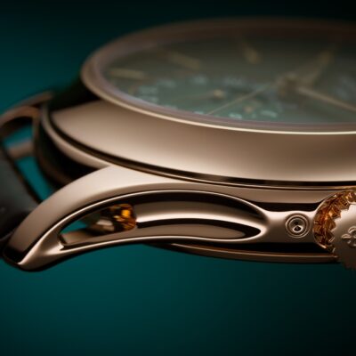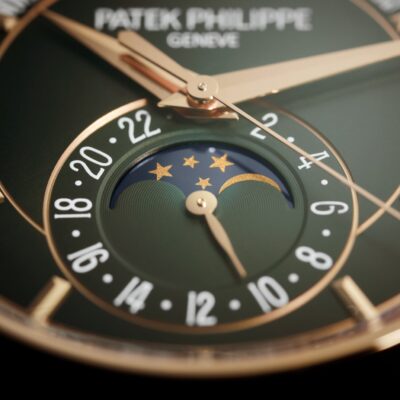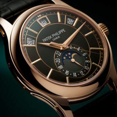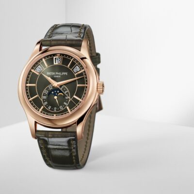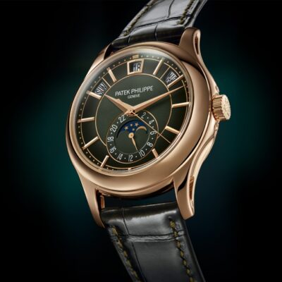 Unworn Luxury Patek Philippe Complication watch. The 18k Rose Gold Annual Calendar / Moonphases, 40mm, Reference 5205R-011. The model has elegant Olive green sunburst dial with black-gradient rim. The 18k Rose Gold faceted applied index hour markers and hands, the Patek Philippe logo at 12 o’clock. On the outer edge of the dial there is a minute scale consisting of 18k Rose Gold dots. The patented annual calendar is ingenious mechanism in three apertures arranged along an arc in the upper half of the dial. In its composition Date display at the 12 o’clock position, Day of the week display at the 10 o’clock position, Month display at the 2 o’clock position. Single combination sub-dial displaying: 24 hours and (inner moonphase) at the 6 o’clock position. Polished Pull/push18k Rose Gold crown that with ribbed edge for comfortable grip and logo Patek Philippe are located on the right side of the case. The dial closed by a Scratch-resistant Sapphire Crystal and Scratch-resistant Sapphire Crystal case back. The watch is fixed slightly concave 18k White Gold bezel. The highlight of this model is the delicately pierced lugs for strap. The watch Patek Philippe Caliber 324 S QA LU 24H/206 has Self-winding mechanical movement, containing 34 Jewels, and power reserve min. 35 hours, max. 45 hours. This model presented on shiny two-tone green hand-patinated alligator leather with square scales, handstitched secured by an 18k Rose Gold Prong buckle. The water resistance is up to 30m/100ft (3 ATM).