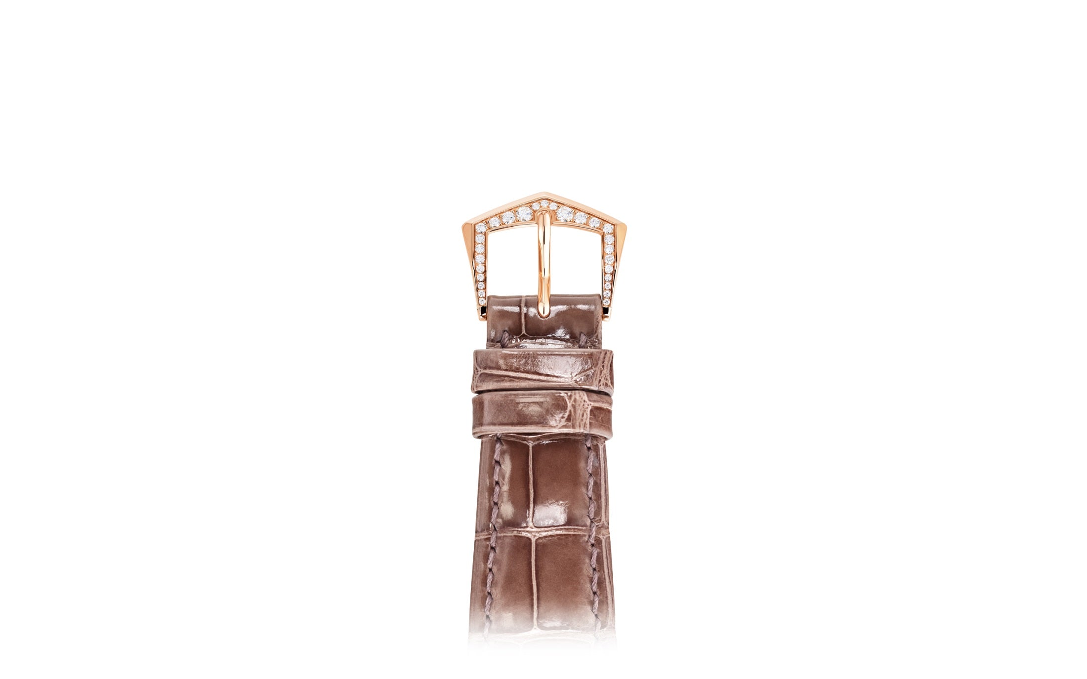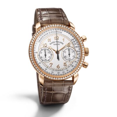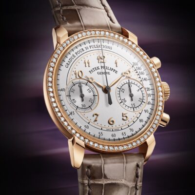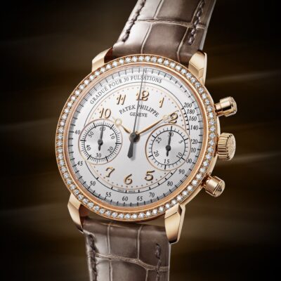 Luxury Ladies watch Patek Philippe Complication Chronograph 38mm and Reference 7150/250R-001. This is excellent combine’s modern spirit with classic beauty. The timelessly discreet case in 18K Rose Gold, embellished with vintage round guilloché buttons, confirms this. Looks harmonious. The beautiful silvery opal dial with Breguet-style hands in 18K Rose Gold. The watch is also embellished with luxurious Breguet-style Arabic numerals in 18K Rose Gold. Hour and minute markers are placed around the inner ring dial. And on its outer edge there is a pulsometer scale. Two additional dials perform chronograph functions: 30-minute counter at 3 o’clock and small seconds subdial at 9 o’clock. Polished Screw-down 18k Rose Gold crown that with ribbed edge for comfortable grip and logo Patek Philippe with round guilloché buttons are located on the right side of the case. The slightly curved sapphire that covers the dial is vintage “box” glass, but it scratch resistant. The back cover is also made of sapphire glass, she allows you to see the magical work of the movement. The watch is equipped fixed polished 18k Rose Gold by a bezel encircled with 72 diamonds: ~0.78 ct. The watch Patek Philippe Caliber CH 29‑535 PS has manually wound mechanical movement, containing 33 Jewels, and power reserve 65 hours. This watch presented on shiny mink gray Alligator leather hand-stitched strap with 18k Rose Gold Prong buckle with 27 diamonds: ~0.21. The water resistance is up to 30m/100ft (3 ATM).