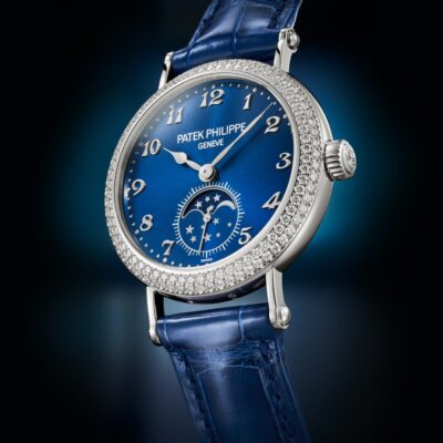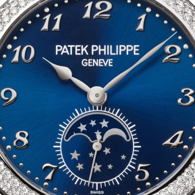 Luxury Ladies’ watch Patek Philippe Complication Moon Phases 18k White Gold, 33mm, Reference 7121/200G-001. The model has elegant Blue dial is enhanced by a sunburst decoration creating subtle light effects, and 18k White Gold intricate shape Poire hands. The dial decorate large applied Breguet 18k White Gold hour markers in the form Arabic numeral. On the outer edge of the dial there is a minute scale consisting of 18k White Gold dots. At the 6 o’clock position there is one sub-dial that stands out like stars in the night sky with a small second hand. Inside it, an indicator of the phases of the moon is organically inscribed inside. Screw-down Stainless Steel crown, that logo Patek Philippe. The dial closed by a Scratch-resistant Sapphire Crystal and Scratch-resistant Sapphire Crystal case back. A special highlight of this model is the 18K White Gold bezel with a double row of 132 (~1.09 cts.) brilliant-cut diamonds based on the exclusive lacy Dentelle gem setting technique. The watch Patek Philippe Caliber 215 PS LU has manually wound mechanical movement, containing 18 Jewels, and power reserve min. 39 hours, max. 44 hours. This watch presented on shiny blue Alligator leather with square scales, hand-stitched, and an 18k White Gold Prong buckle. The water resistance is up to 30m/100ft (3 ATM).