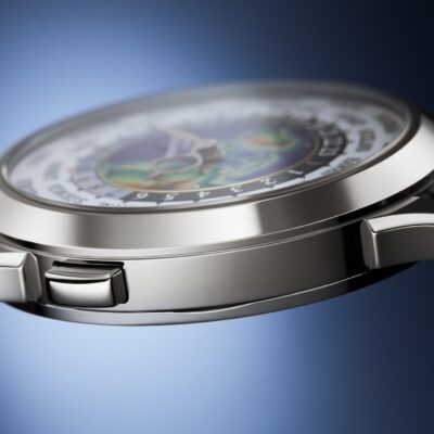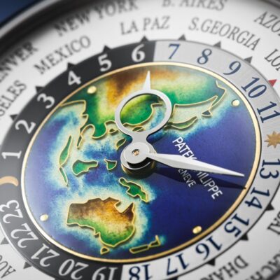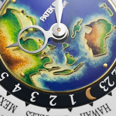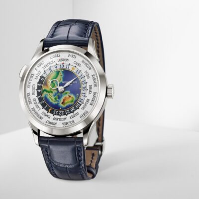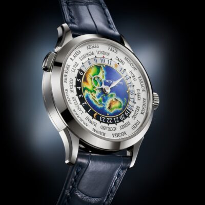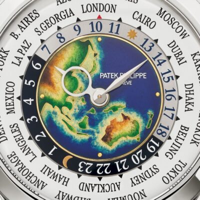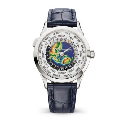 Luxury Patek Philippe Complication World Time Rare Handcrafts, 18k White Gold, 38,5mm and Reference 5231G-001. The highlight of this model is the Grand Feu cloisonne enamel on central part of the dial depicting Oceania and Southeast Asia, fixed with 4 Rose Gold spangles on the outer perimeter of the dial is placed City disk. A closer to dial center located 24-hour disk in 18k White Gold with day/night zones. It shows the time at a glance in all 24 time zones at any given moment. To change time zones, simply press the pusher at 10 o’clock and all displays will be simultaneously corrected. A special decoration are the hands from 18k White Gold of an unusual shape: a skeletonized hour hand with a large circle resembling a magnifying glass and a minute hand in the form of a spear. The 18k White Gold crown with ribbed edge for comfortable grip and logo Patek Philippe. The dial closed by a Scratch-resistant Sapphire Crystal and sapphire-crystal case back which allows of the case, allows you to see the magical work of the movement. The watch is equipped fixed polished 18k White Gold bezel. The watch Patek Philippe Caliber 240 HU Self-winding mechanical movement, containing 33 Jewels, and has a power reserve of min. 48 hours. This model presented on matte navy blue Alligator leather strap with square scales, hand-stitched and 18k White Gold Fold-over clasp. The water resistance is up to 30m/100ft (3 ATM).