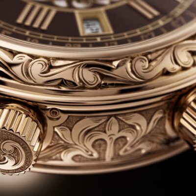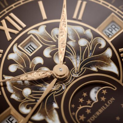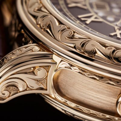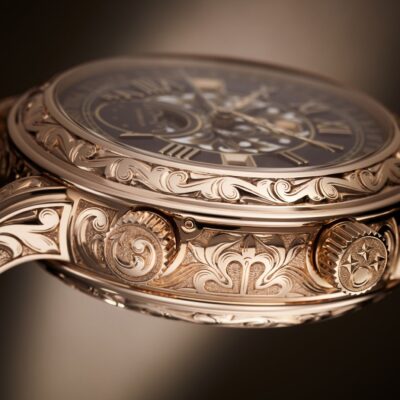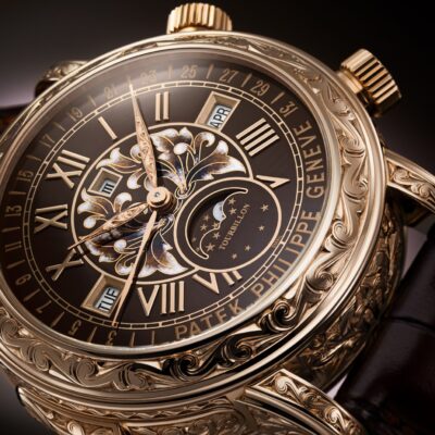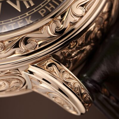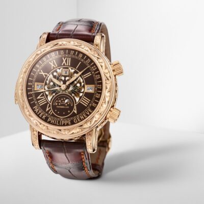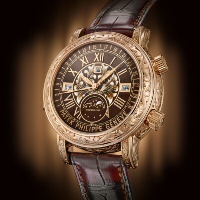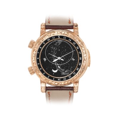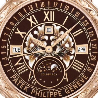 Unworn Luxury Patek Philippe Grand Complication watch, Reference 6002R-001. The Sky Moon Tourbillon is an expensive, complex wristwatch 18k Rose Gold large case 44mm. The double-faced case, crowns, and slide for the minute repeater including the rim of the case back are engraved by hand with “volutes and arabesques”. The dial on the front is decorated of enameling Grand Feu brown. The periphery of the dial, the moon-phase aperture, and the moon of the rotating disc are executed in champlevé enamel. With this technique, the base metal must first be precisely milled out so that individual elements such as the minute scale remain relieved. Then, the recesses are manually filled with enamel compound. The center of the dial features a decor in grand feu cloisonné enamel that was created with the help of thin flat gold wire. Stands out the dial large 18k Rose Gold Roman numerals hour markers.  The leaf-shaped hands are 18k Rose Gold and engraved in the same style as the case. Topside are the perpetual calendar indications, including day at 9 o’ clock position, indicate month at 3 o’ clock date position, and retrograde date display, along with mean civil time, and a moonphase at 6 o’ clock date position. At 12 o’ clock, position an indication showing where you are in the Leap Year cycle.  On the other side, we have an amazing celestial chart: three superposed discs move in different, precisely calculated trajectories to recreate the apparent motion of the moon and the stars as they can be viewed from the northern hemisphere. The model has one-minute tourbillon with minute repeater, which is actuated by a slider located on the left side of the case. The 18k Rose Gold screw-down crown that with ribbed edge for comfortable grip. The dial closed by a Scratch-resistant Sapphire Crystal and Scratch-resistant Sapphire Crystal case back. The watch is fixed 18k Rose Gold bezel. The bezel and lugs are engraved also by hand with “volutes and arabesques”.  The watch Patek Philippe Caliber R TO 27 QR SID LU CL has Mechanical manually wound movement, containing 55 Jewels, and power reserve min. 38 hours, max. 48 hours. This model presented on chestnut patinated Alligator strap with square scales, hand-stitched, and Hand-engraved 18k Rose Gold  fold-over clasp. Case is humidity and dust protected only (not water-resistant).
