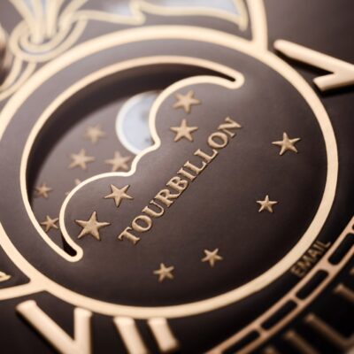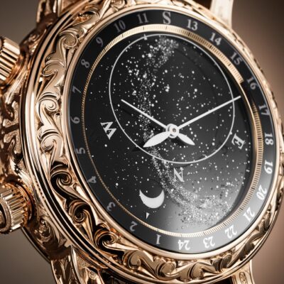 • Functions: Sky Moon Tourbillon. Double-faced wristwatch. Minute repeater with “cathedral” gongs. Tourbillon. Front side: Perpetual calendar with retrograde date hand. Day, month, leap year in apertures. Hours and minutes of mean solar time. Moon phases. Reverse side: sidereal time, sky chart, phases and orbit of the moon