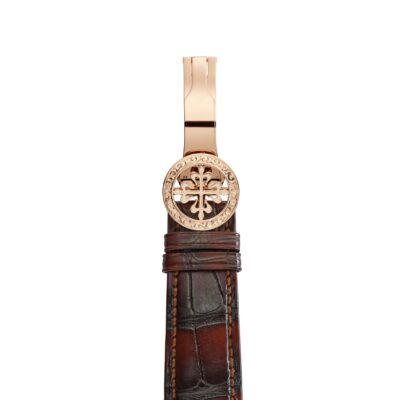 • Bracelet Material: Chestnut patinated Alligator strap with square scales, hand-stitched