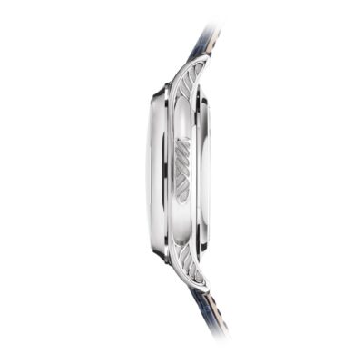 - Bracelet Material: Shiny navy blue Alligator strap with square scales, hand-stitched