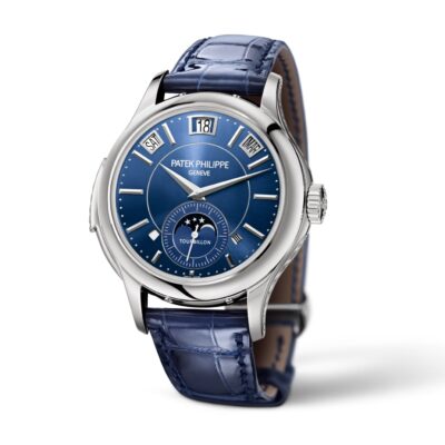 Unworn Luxury Patek Philippe Grand Complication watch, Reference 5207G-001. 18k White Gold case 41mm, embellished with hand engraving. Looks spectacular striking sunburst blue dial. The 18k White Gold applied baton markers and large dauphine 18k White Gold hands beautifully compliment the simplicity of this marvelous timepiece. Around the outer rim dial, small 18k White Gold Dot minute marks are applied. The model has minute repeater, which is actuated by a slider located on the left side of the case. The aperture at 12 o’ clock displays date. The window at between o’ clock 1 and 2 o’ clock indicate month and between o’ clock 10 and 11 o’ clock day of the week. The sub-dial at 6 o’ clock incorporates small seconds function and moon phases.The leap year and the day/night indicators sit on either side of the seconds sub-dial. On him spotlights the inscription large “TOURBILLON” to indicate the presence of one of the most spectacular horological complications. Polished 18k White Gold screw-down crown that with ribbed edge for comfortable grip and logo Patek Philippe. The dial closed by a Scratch-resistant Sapphire Crystal and Scratch-resistant Sapphire Crystal case back and interchangeable full back. The watch is fixed polished 18k White Gold bezel. The watch Patek Philippe Caliber R TO 27 PS QI has Mechanical manually wound movement, containing 37 Jewels, and power reserve min. 38 hours, max. 48 hours. This model presented on shiny navy blue Alligator strap with square scales, hand-stitched, and 18k White Gold fold-over clasp. Case is humidity and dust protected only (not water-resistant).