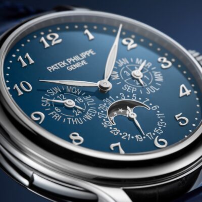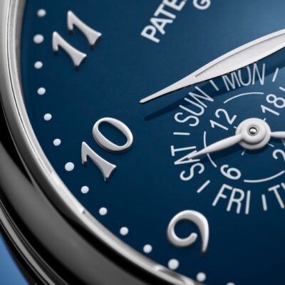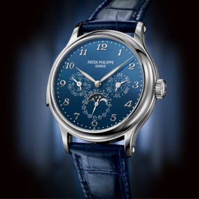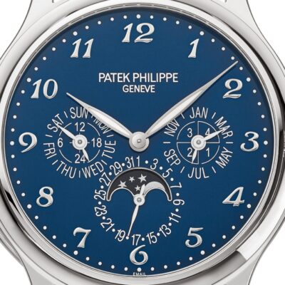 Unworn Luxury Patek Philippe Grand Complication watch, 42mm, 18k White Gold, Reference 5374G-001. The case is characterized recessed satin-finished flanks that create a nice contrast with the other polished surfaces and against the cabochons that decorate the ends of the lugs. On the left side, we find the slide for actuating the minute repeater. The grand Feu Enamel dial is high-gloss finished with an intense blue colour that makes the applied large 18k White Gold Breguet numerals stand out clearly. The three subdials display the perpetual calendar indications (day, date, month, and leap year cycle) together with a 24-hour display at 9 o’clock. The moon-phase is displayed at 6 o’clock, well highlighted by in a champlevé́ white gold frame. The leaf-shaped hands in 18k White Gold are filled with a luminous coating for improved legibility even in poor light conditions.  Polished 18k White Gold crown that with ribbed edge for comfortable grip and logo Patek Philippe. The dial closed by a Scratch-resistant Sapphire Crystal and Scratch-resistant Sapphire Crystal case back and interchangeable full back. The watch is equipped fixed polished 18k White Gold by a concave bezel. The watch Patek Philippe Caliber R 27 Q has Self-winding mechanical movement, containing 39 Jewels, and power reserve min. 38 hours, max. 48 hours. This model presented on Shiny dusk blue Alligator strap with square scales, hand-stitched, and 18k White Gold fold-over clasp. Case is humidity and dust protected only (not water-resistant).