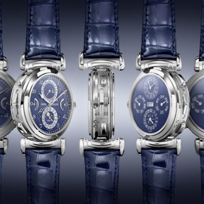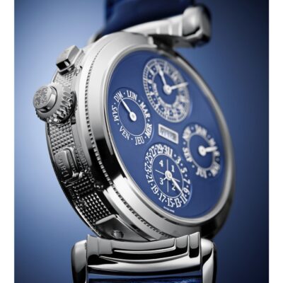 Of the main dial shows the power reserve indicators for the movement and striking mechanisms are located at the 9 o’clock and 3 o’clock positions. The date and moon phase subdial is found at the 6 o’clock position with strikework and function indicators to the left and right of this subdial. Crown position indicator (winding [R], alarm setting [A], timesetting [H]). On the reverse face you find the perpetual calendar which shows the year in a 4 digit display at the centre of the watch, with the month subdial at 3 o’clock, day and leap year subdial and the 6 o’clock, date at 9 o’clock and lastly a 24 hour indicator at 12 o’clock. The Grande Sonnerie, Petite Sonnerie, minute repeater can be set and controlled with ease. It strikes the time on three gongs: either automatically every quarter-hour with the Grande or Petite Sonnerie, accurate to the minute with the minute repeater.
