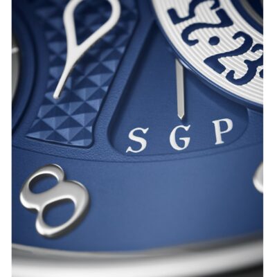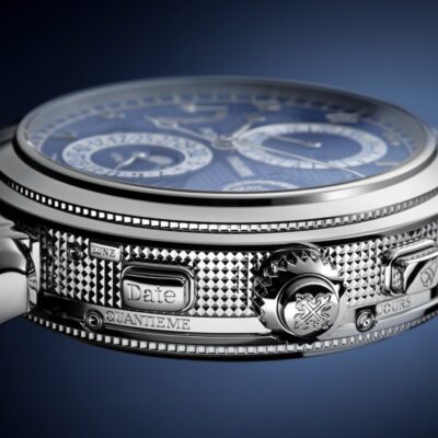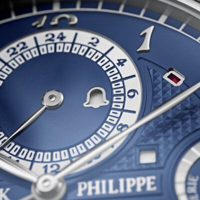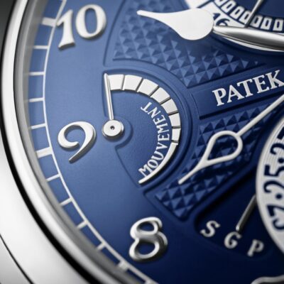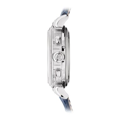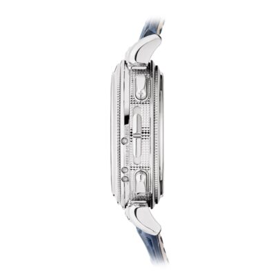 The dials closed by a Scratch-resistant Sapphire Crystal.  The watch is fixed 18k White Gold bezels. The power behind the Grandmaster Chime is the Caliber300 GS AL 36-750 QIS FUS IRM offering over 20 functions and has Mechanical manually wound movement, containing 108 Jewels, and a movement power reserve of up to 72 hours and a strikework power reserve of up to 30 hours. This model presented on Shiny navy blue Alligator strap with square scales, hand-stitched, fold-over clasp. Case is humidity and dust protected only (not water-resistant).