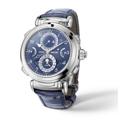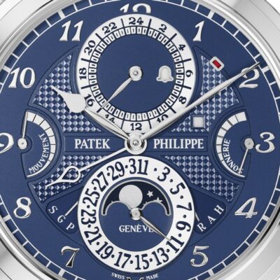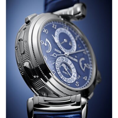 Unworn Luxury Patek Philippe Grand Complication watch, Reference 6301P-010. The Grande Sonnerie is an expensive, complex wristwatch 18k White Gold large case 47,7mm adorned with a hand-guilloched hobnail pattern.  This piece has two faces, showing twenty complications including five striking functions.  The front blue opaline dial  with appliqued classic 18k White Gold  Brequet Arabic numerals and a hand-guilloched hobnail-patterned centre and minute  track located around rim. The delicate Classical minute 18k White Gold hand. The 18k White Gold hour and second hands with original tips emphasize the classic style of this model. The other dial in white with gold hands for hours and minutes with a 24 subdial.