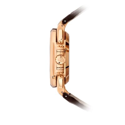 The new Luxurious Patek Philippe Nautilus Flyback Chronograph Date 40.5mm 18k Rose Gold Ref.5980R-001 is the perfect combination of traditional elegance and sporty style with a timeless design accentuated by the subtle alternation of satin and polished finishing elements handcrafted on the case, on the bezel, on the bracelet. To achieve perfect readability (a Patek Philippe requirement for all its watches), this model’s Black brown dial with horizontal embossing is equipped with 18k Rose Gold luminous indexes. The time is indicated by large hour and minute hands in 18k Rose Gold with a luminescent coating, as well as a thin and elegant sliding second hand (chronograph hand), also made in 18k Rose Gold. The outer contour of the dial has an accurate minute scale with Arabic numerals every 5 minutes. The aperture date indicator is at the 3 o’clock position. The flyback chronograph with white and red hand operation can be monitored on the combined sub-dial located at the 6 o’clock position. On its outer silver contour there is a 60-minute dial, and on the inner one dark brown – a 12-hour monometer. A polished 18k Rose Gold Screw-down crown with a ribbed edge for easy grip and the Patek Philippe logo is completes the watch’s harmony. Also on the right side are polished 18k Rose Gold pushers for the chronograph. The dial closed by a Scratch-resistant Sapphire Crystal. Sapphire-crystal too case back, which allows of the case, allows you to see the magical work of the movement. The wide, rounded octagonal 18k Rose Gold bezel, satin on the front and polished on the sides, provides a wide view of the dial as the horizon is visible through the porthole. What’s more, the side protrusions, also called “lugs”, are inspired by the hinges on these windows. The Model has Patek Philippe Caliber CH 28‑520 C, with a self-winding mechanical movement containing 45 Jewels, with a power reserve of min. 45 hours – max. 55 hours. This beautiful sport-chic watch presented on matte dark brown Alligator/Crocodile leather strap with square scales, hand-stitched also a Patek Philippe patented 18k Rose Gold Nautilus fold-over clasp. The water resistance is up to 120m/394ft (12 ATM).