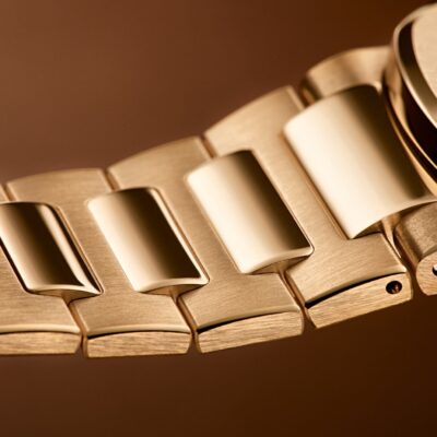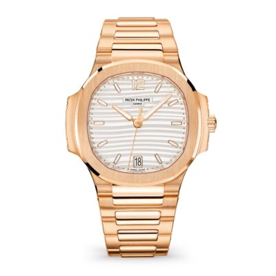 Ladies Watch Patek Philippe Nautilus 18k Rose Gold case with polished and satin finishes, 35,2mm, Reference 7118/1R-001 – has been the standard in luxury, because combine elegance, sporty style and timeless design. Is striking watch boasts a Silvery Opaline with horizontally embossed dial, 18k Rose Gold applied hour markers and Arabic numeral at the 12 o’clock positioning with a luminescent coating for easy readability in dim lighting as well as Dot minute markers around the outer rim. The sweep seconds hand and date in an aperture features at the 6 o’clock positioning give this model a clean profile and make keeping track of both date and time convenient. Complementing the elegant dial are 18k Rose Gold polished luminous alpha-style shape hands. A polished 18k Rose Gold Screw-down crown with a ribbed edge for easy grip and the Patek Philippe logo is completes the watch’s harmony. The dial closed by a Scratch-resistant Sapphire Crystal. Sapphire-crystal too case back, which allows of the case, allows you to see the magical work of the movement. The wide hexagonal with polished and satin finishes bezel, in a blushing 18k Rose Gold, provides a wide view of the dial as the horizon is visible through the porthole. Moreover, the side protrusions, also called “lugs”, are inspired by the hinges on these windows. The Model has caliber Patek Philippe Caliber 324 S C, with a self-winding mechanical movement containing 29 Jewels, with a power reserve of min. 35 hours – max. 45 hours. In addition, this beautiful sport-chic watch on presented on the 18k Rose Gold bracelet with polished and satin finishes and 18r Rose Gold Nautilus fold-over clasp with an integrated adjustment system. The water resistance is up to 60m/200ft (6 ATM).