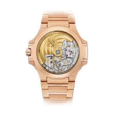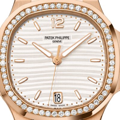 Ladies Watch Patek Philippe Nautilus Ladies Automatic 18k Rose Gold case with polished and satin finishes, 35,2mm, Reference 7118/1200R-001 – has been the standard in luxury, because combine elegance, sporty style and timeless design. Is striking watch boasts a Silvery Opaline dial with gently undulating embossed decor dial, 18k Rose Gold applied hour markers and Arabic numeral at the 12 o’clock positioning with a luminescent coating for easy readability in dim lighting as well as Dot minute markers around the outer rim. The sweep seconds hand and date in an aperture features at the 6 o’clock positioning give this model a clean profile and make keeping track of both date and time convenient. Complementing the elegant dial are 18k Rose Gold polished luminous alpha-style shape hands. A polished 18k Rose Gold Screw-down crown with a ribbed edge for easy grip and the Patek Philippe logo is completes the watch’s harmony. The dial closed by a Scratch-resistant Sapphire Crystal. Sapphire-crystal too case back, which allows of the case, allows you to see the magical work of the movement. The wide rounded octagonal with polished and satin finishes bezel, in an 18k Rose Gold, provides a wide view of the dial, as the horizon is visible through the porthole. Moreover, side protrusions, also called “lugs”, are inspired by the hinges on these windows. In addition, 56 diamonds (~0.67 carats) decorating the bezel make it fantastic. The Model has caliber Patek Philippe Caliber 324 S C, with a self-winding mechanical movement containing 29 Jewels, with a power reserve of min. 35 hours – max. 45 hours. In addition, this beautiful sport-chic watch on presented on the 18k Rose Gold bracelet with polished and satin finishes and 18k Rose Gold Nautilus fold-over clasp. The water resistance is up to 60m/200ft (6 ATM).