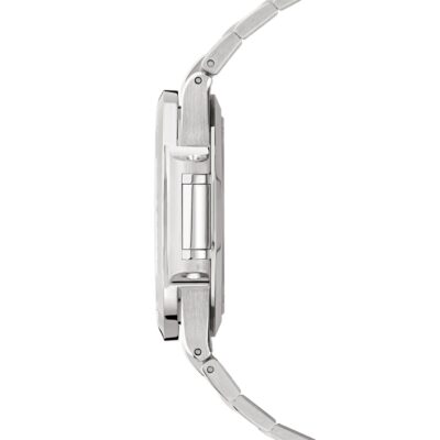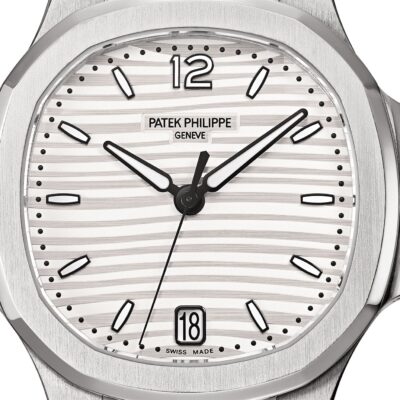 Ladies Watch Patek Philippe Nautilus Ladies Automatic Stainless Steel case with polished and satin finishes, 35,2mm, Reference 7118/1A-010 – has been the standard in luxury, because combine elegance, sporty style and timeless design. Is striking watch boasts a Silvery Opaline with gently undulating embossed decor dial, 18k White Gold applied hour markers and Arabic numeral at the 12 o’clock positioning with a luminescent coating for easy readability in dim lighting as well as Dot minute markers around the outer rim. The sweep seconds hand and date in an aperture features at the 6 o’clock positioning give this model a clean profile and make keeping track of both date and time convenient. Complementing the elegant dial are 18k White Gold polished luminous alpha-style shape hands. A polished Stainless Steel Screw-down crown with a ribbed edge for easy grip and the Patek Philippe logo is completes the watch’s harmony. The dial closed by a Scratch-resistant Sapphire Crystal. Sapphire-crystal too case back, which allows of the case, allows you to see the magical work of the movement. The wide rounded octagonal with polished and satin finishes bezel, in a Stainless Steel, provides a wide view of the dial as the horizon is visible through the porthole. Moreover, the side protrusions, also called “lugs”, are inspired by the hinges on these windows. The Model has caliber Patek Philippe Caliber 324 S C, with a self-winding mechanical movement containing 29 Jewels, with a power reserve of min. 35 hours – max. 45 hours. In addition, this beautiful sport-chic watch on presented on the Stainless Steel bracelet with polished and satin finishes and Stainless Steel Nautilus fold-over clasp. The water resistance is up to 60m/200ft (6 ATM).