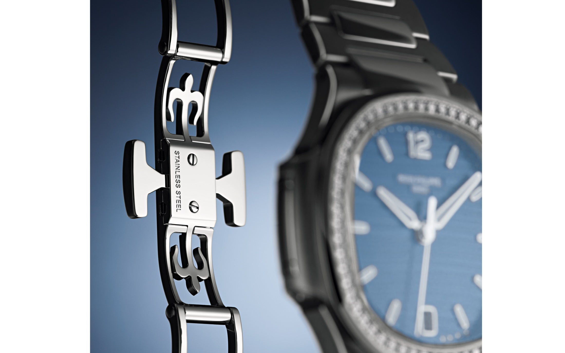 Ladies Watch Patek Philippe Nautilus Ladies Automatic Stainless Steel case with polished and satin finishes, 35,2mm, Reference 7118/1200A-001 – has been the standard in luxury, because combine elegance, sporty style and timeless design. Is striking watch boasts a Blue Opaline dial with gently undulating embossed decor dial, 18k White Gold applied hour markers and Arabic numeral at the 12 o’clock positioning with a luminescent coating for easy readability in dim lighting as well as Dot minute markers around the outer rim. The sweep seconds hand and date in an aperture features at the 6 o’clock positioning give this model a clean profile and make keeping track of both date and time convenient. Complementing the elegant dial are 18k White Gold polished luminous alpha-style shape hands. A polished Stainless Steel Screw-down crown with a ribbed edge for easy grip and the Patek Philippe logo is completes the watch’s harmony. The dial closed by a Scratch-resistant Sapphire Crystal. Sapphire-crystal too case back, which allows of the case, allows you to see the magical work of the movement. The wide rounded octagonal with polished and satin finishes bezel, in a Stainless Steel, provides a wide view of the dial, as the horizon is visible through the porthole. Moreover, side protrusions, also called “lugs”, are inspired by the hinges on these windows. In addition, 56 diamonds (~0.67 carats) decorating the bezel make it fantastic. The Model has caliber Patek Philippe Caliber 324 S C, with a self-winding mechanical movement containing 29 Jewels, with a power reserve of min. 35 hours – max. 45 hours. In addition, this beautiful sport-chic watch on presented on the Stainless Steel bracelet with polished and satin finishes and Stainless Steel Nautilus fold-over clasp. The water resistance is up to 60m/200ft (6 ATM).