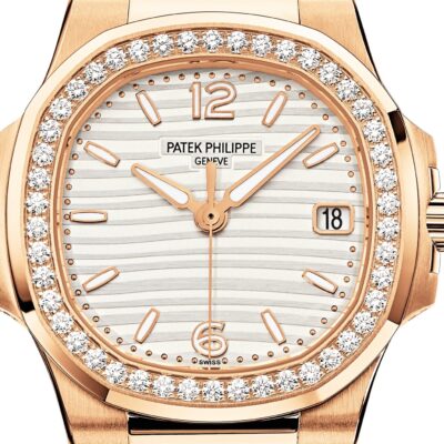 Ladies Watch Patek Philippe Nautilus Quartz Diamond 18k Rose Gold case, 32mm, Reference 7010/1R-011- has been the standard in luxury, because combine elegance, sporty style and timeless design. Is striking watch boasts a Silvery Opaline with horizontally embossed dial, 18k Rose Gold applied hour markers and Arabic numerals at the 6 and 12 o’clock positioning a luminescent coating for easy readability in dim lighting as well as Dot minute markers around the outer rim. The sweep seconds hand and date in an aperture features at the 3 o’clock positioning give this model a clean profile and make keeping track of both date and time convenient. Complementing the elegant dial are polished 18k Rose Gold luminous hands. A polished 18k Rose Gold crown with a ribbed edge for easy grip and the Patek Philippe logo is completes the watch’s harmony. The dial closed by a Scratch-resistant Sapphire Crystal. The watch features a solid 18K Rose Gold matte case back. The wide hexagonal bezel, bevel features 46  (~0.73 carats) individually cut diamonds, which are inlaid in a blushing 18k Rose Gold base, provides a wide view of the dial as the horizon is visible through the porthole. Moreover, the side protrusions, also called “lugs”, are inspired by the hinges on these windows. Model has caliber Patek Philippe Caliber E 23‑250 S C, a Quartz movement powered by a silver oxide battery with a 3-year lifespan.  In addition, an 18k Rose Gold bracelet with 18r Rose Gold Nautilus fold-over clasp is fitted to this beautiful sport-chic watch. The water resistance is up to 60m/200ft (6 ATM).