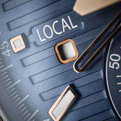 • Functions: Hour, Minute, Flyback chronograph, Central chronograph hand, 60-minute counter, Two time zones: local and home time indication, Day/night indication for local time and home time in apertures, Date coupled with local time by hand