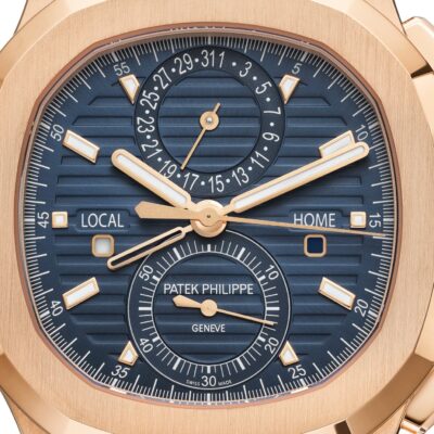 The new Luxurious Patek Philippe Nautilus Travel Time Chronograph 40.5mm 18k Rose Gold Ref. 5990/1R-001 is the perfect combination of traditional elegance and sporty style with a timeless design accentuated by the subtle alternation of satin and polished finishing elements handcrafted on the generous case, on the bezel, on the bracelet. To achieve perfect readability (a Patek Philippe requirement for all its watches), this model’s Sunburst blue dial with horizontal embossing is equipped with 18k Rose Gold luminous indexes. The time is indicated by large baton-style  hour and minute hands in 18k Rose Gold with a luminescent coating, as well as a thin and elegant sliding second hand (chronograph hand), also made in 18k Rose Gold. This watch features an 18kt Rose Gold skeletonized hand to indicate a second time zone (one hour backwards or forwards). The outer contour of the dial has an accurate minute scale with Arabic numerals every 5 minutes. The symmetrical layout of this dial displays two subdials – one for the date at the 12 o’clock position, and one for the chronograph minutes at the 6 o’clock position, and on each side, a day/night indicator, one for home (at the 3 o’clock position) and one for local time (at the 9 o’clock position).  A polished 18k Rose Gold 2-position Screw-down crown with a ribbed edge for easy grip and the Patek Philippe logo allows you to wind the watch and set the time is completes the watch’s harmony.  On the right side are polished 18K Rose Gold chronograph pushers. The ones on the left control up a skeletonized hand. The dial closed by a Scratch-resistant Sapphire Crystal. Sapphire-crystal too case back, which allows of the case, allows you to see the magical work of the movement. The wide, rounded octagonal 18k Rose Gold bezel, satin on the front and polished on the sides, provides a wide view of the dial as the horizon is visible through the porthole. What’s more, the side protrusions, also called “lugs”, are inspired by the hinges on these windows. The Model has Patek Philippe Caliber CH 28‑520 C FUS, with a self-winding mechanical movement containing 34 Jewels, with a power reserve of min. 45 hours – max. 55 hours. This beautiful sport-chic watch presented on the integrated 18k Rose Gold bracelet with a Patek Philippe patented 18k Rose Gold  Nautilus fold-over clasp. The water resistance is up to 120m/394ft (12 ATM).