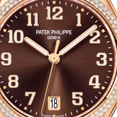 New Patek Philippe Twenty~4 Automatic luxury watch, 36mm, 18k Rose Gold with 160 diamonds ~0,77ct, Ref. 7300/1200R-001. Reliable and modern, feminine and elegant meticulously crafted is truly a sight to behold and a joy to wear. Despite its sophistication, this watch is presented as a casual chic that can be worn every day – a kind of all-rounder. The first model in the collection to feature a round case that is 10.05mm thin yet comfortable and has a modern look on the wrist. The elegant Brown dial with sunburst finish along is eye-catching. It features sporty pilot-style 18k Rose Gold Arabic numerals with luminescent coating. The time indicated by large polished luminous nautilus-like (rounded batons) hour and minute 18k Rose Gold hands, ensuring perfect legibility even in the dark. These are complemented by a slim and elegant 18k Rose Gold second hand (Sweep seconds hand). As a classic time and date watch, this model has a date window at 6 o’clock. Thin white minute markers with 18k Rose Gold squares every 5 minutes run along the outer edge of the dial. A polished 18k Rose Gold crown with a ribbed edge for a comfortable grip and the Patek Philippe logo is the finishing touch to the perfect picture. The dial is covered with a scratch-resistant sapphire crystal. A Sapphire Crystal case back, also made allows you to see the magical workings of the movement. The elegant highlight of model is the fixed sparkling 18k Rose Gold bezel set with 160 diamonds (~0,77ct) flawless. In addition, it is much more complex than just two rows of diamonds surrounding the dial. The bezel follows the curvature of the case and is raised at 12 and 6 o’clock, creating continuity with the bracelet. The model is equipped with a Patek Philippe Caliber 324 S C, with a self-winding mechanical movement containing 29 Jewels, with a power reserve of min. 35 hours – max. 45 hours. This beautiful watch is presented on a seamlessly integrated into the case of the 18k Rose Gold bracelet, and the steps of the links follow the steps of the lugs, giving the watch a more barrel-shaped silhouette. The same applies to the module between the lugs, which follows the shape of the center link. The bracelet are fastens with Patek Philippe’s patented polished 18k Rose Gold folding clasp and engraved with the Calatrava cross. Opening the clasp reveals the engraved Patek Philippe logo with the word GENEVE. Water resistant up to 30m/99ft (3 ATM).