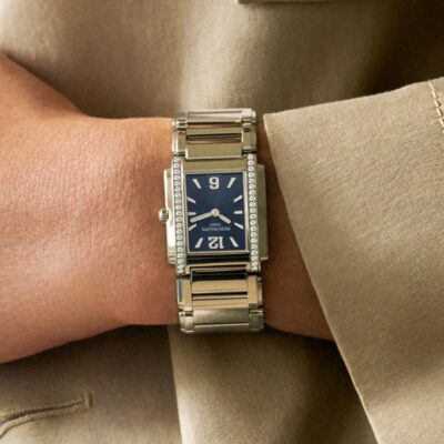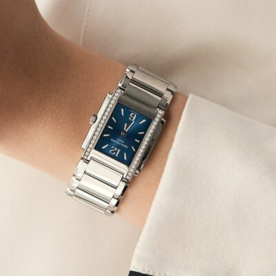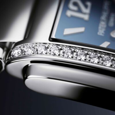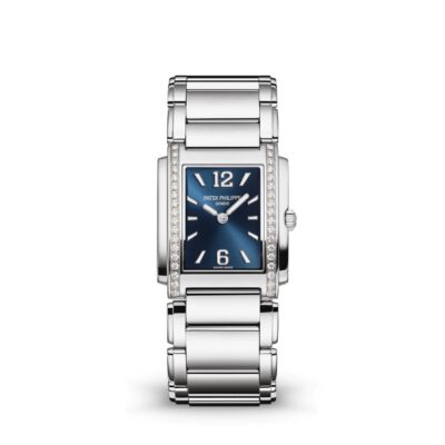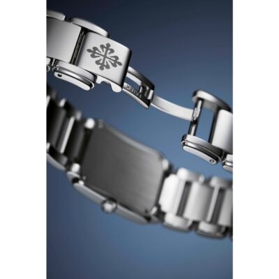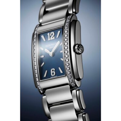 New Patek Philippe Twenty~4 Quartz Diamond Ladies luxury watch, 25.1 x 30 mm, Stainless Steel with 36 diamonds (~0.42 ct), Ref. 4910/1200A-001. This prestigious wristwatch is the epitome of timeless feminine elegance. The combination of classic and modern has made this watch the perfect companion for active professional women who want to stand out and express themselves. The sophisticated design of this stunning watch complements both business dresses and evening attire. The main attraction of the model, of course, is the Blue dial, decorated with sunbeams. Its beauty is emphasized large by 18k White Gold trapezoid-shaped markers and well-read even in the dark 18k White Gold Arabic numerals 6 and 12 with luminescent coating. Hands in the form of wands made of 18k White Gold with a luminescent coating also look luxurious. The polished Stainless Steel crown, the Patek Philippe logo the Calatrava Cross trademark, completes the perfect image. The dial is covered with a slightly curved scratch-resistant sapphire crystal, which emphasizes the curves of the case. The solid case back is made of Stainless Steel. The elegant highlight of the model is a slightly curved case with stunning flawless Wesselton diamonds arranged vertically along the case on a fixed Stainless Steel bezel, 18 on each side. The model is equipped with a Patek Philippe Quartz movement Caliber E 15 with silver oxide battery 1.55 V and a service life of 3 years. This fabulously beautiful timepiece is presented on a solid Stainless Steel bracelet with wide, gently curved central links framed by narrow double-tiered links. The link steps follow the steps of the lugs, giving the watch a more barrel-shaped silhouette. The same applies to the module between the lugs, which follows the shape of the central link. It fastens with a Patek Philippe patented folding clasp in polished Stainless Steel engraved and the Calatrava cross. Water resistant up to 30m/99ft (3 ATM).