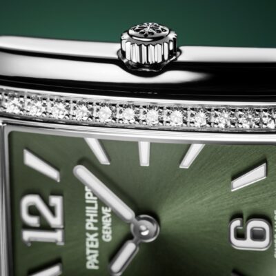 New Patek Philippe Twenty~4 Quartz Diamond Ladies luxury watch, 25.1 x 30 mm, Stainless Steel with 36 diamonds (~0.42 ct), Ref. 4910/1200A-011. This prestigious wristwatch is the epitome of timeless feminine elegance. The combination of classic and modern has made this watch the perfect companion for active professional women who want to stand out and express themselves. The sophisticated design of this stunning watch complements both business dresses and evening attire. The main attraction of the model is an Olive green dial with sunbeams decorated. Its beauty is emphasized large by 18k White Gold trapezoid-shaped markers and well-read even in the dark 18k White Gold Arabic numerals 6 and 12 with luminescent coating. Hands in the form of wands made of 18k White Gold with a luminescent coating also look luxurious. The polished Stainless Steel crown, the Patek Philippe logo the Calatrava Cross trademark, completes the perfect image. The dial is covered with a slightly curved scratch-resistant sapphire crystal, which emphasizes the curves of the case. The solid case back is made of Stainless Steel. The elegant highlight of the model is a slightly curved case with stunning flawless Wesselton diamonds arranged vertically along the case on a fixed Stainless Steel bezel, 18 on each side. The model is equipped with a Patek Philippe Quartz movement Caliber E 15 with silver oxide battery 1.55 V and a service life of 3 years. This fabulously beautiful timepiece is presented on a solid Stainless Steel bracelet with wide, gently curved central links framed by narrow double-tiered links. The link steps follow the steps of the lugs, giving the watch a more barrel-shaped silhouette. The same applies to the module between the lugs, which follows the shape of the central link. It fastens with a Patek Philippe patented folding clasp in polished Stainless Steel engraved and the Calatrava cross. Water resistant up to 30m/99ft (3 ATM).
