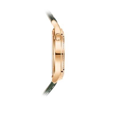 Luxury Patek Philippe Women’s Complication World-Time, 18k Rose Gold, 36mm and Reference 7130R-014. The masters achieve a rethinking of the World Time classic by decorating this model with an original, modern and elegant olive green color. In addition, its central part is a tribute to the rare art of masters who managed to manually create a guilloche pattern in the form of a “Panier” wicker basket. Look good on dial applied 18k Rose Gold index hour markers. Moving outward one-step, we find a 24-hour disk divided into day and night zones, distinguished by their color and symbols of the Sun and Moon. The City Disc, showing all 24 time zones at any given time with their respective cities, is also olive green, but the city names are very legible and printed in large white type. To change the time zone, simply press the button at 10 o’clock and all readings will be adjusted at the same time. Strict Dauphine-inspired central hour and minute hands in 18k Rose Gold add a special touch to the watch. A polished 18k rose gold screw-down crown with a ribbed edge for easy grip and the Patek Philippe logo is located on the right side of the case. The dial closed by a Scratch-resistant Sapphire Crystal and sapphire-crystal case back which allows of the case, allows you to see the magical work of the movement. The watch is equipped Luxury fixed polished 18k Rose Gold bezel set with 62 diamonds (~0.82 ct.). The watch Patek Philippe Caliber 240 HU Self-winding mechanical movement, containing 33 Jewels, and has a power reserve of min. 48 hours. This model presented on shiny olive green Calfskin leather hand-stitched strap. It zips up 18k Rose Gold Prong buckle set with 27 diamonds (~0.21 ct.). The water resistance is up to 30m/100ft (3 ATM).