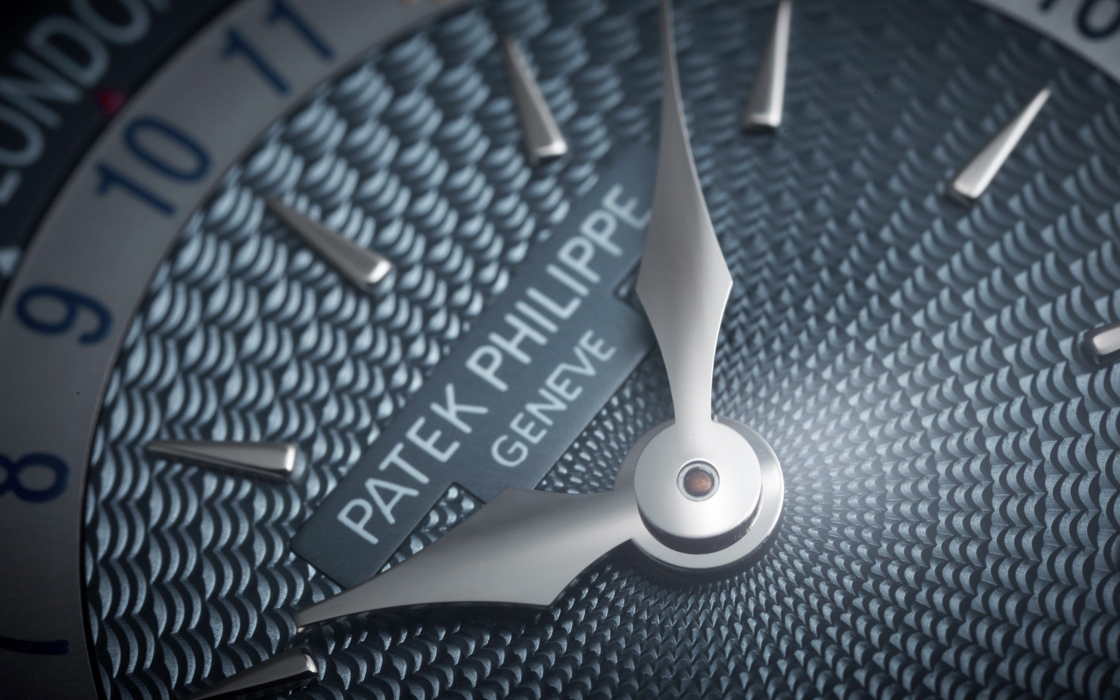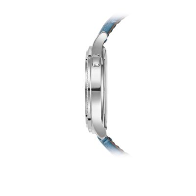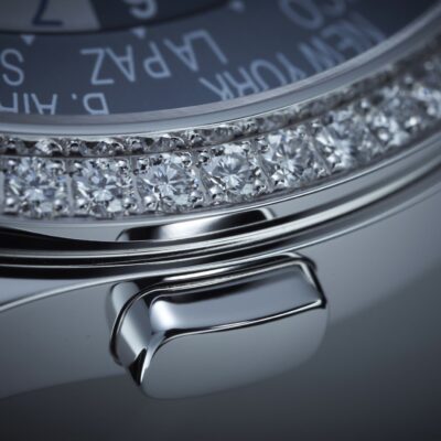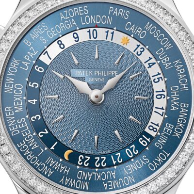 Luxury Patek Philippe Women’s Complication World-Time, 18k White Gold, 36mm and Reference 7130G-016. The masters achieve a rethinking of the World Time classic by decorating this model with an original, modern and elegant Gray-blue color. In addition, its central part is a tribute to the rare art of masters who managed to manually create a guilloche pattern in the form of a “Panier” wicker basket. Look good on dial applied 18k White Gold index hour markers. Moving outward one-step, we find a 24-hour disk divided into day and night zones, distinguished by their color and symbols of the Sun and Moon. The City Disc, showing all 24 time zones at any given time with their respective cities, is also Gray-blue, but the city names are very legible and printed in large white type. To change the time zone, simply press the button at 10 o’clock and all readings will be adjusted at the same time. Strict Dauphine-inspired central hour and minute hands in 18k White Gold add a special touch to the watch. A polished 18k White Gold screw-down crown with a ribbed edge for easy grip and the Patek Philippe logo is located on the right side of the case. The dial closed by a Scratch-resistant Sapphire Crystal and sapphire-crystal case back which allows of the case, allows you to see the magical work of the movement. The watch is equipped Luxury fixed polished 18k White Gold bezel set with 62 diamonds (~0.82 ct.). The watch Patek Philippe Caliber 240 HU Self-winding mechanical movement, containing 33 Jewels, and has a power reserve of min. 48 hours. This model presented on shiny peacock blue Alligator leather with square scales, hand-stitched strap.  It zips up 18k White Gold Prong buckle set with 27 diamonds (~0.21 ct.). The water resistance is up to 30m/100ft (3 ATM).