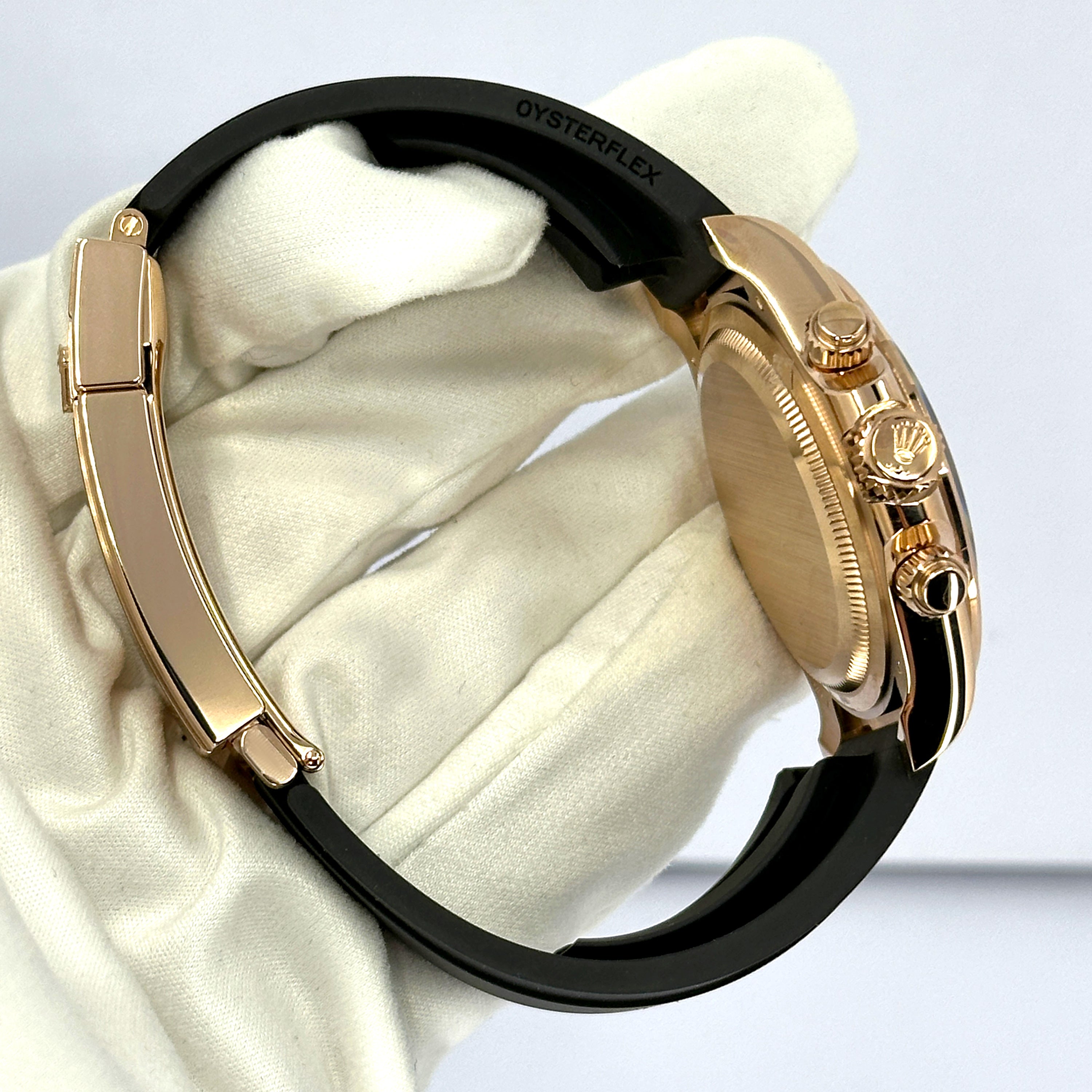 Unworn watch Rolex Cosmograph Daytona 40mm, 18k Everose Gold, Ref# 126515ln-0004. Born for motor racing, the watch combines sporty chic with versatility, making it a must-have for lovers of the fast lanes and the finest cars. The luxurious Rolex Cosmograph Daytona is synonymous with excellent workmanship, first-class technical features and unique looks. Proof of this is the stunning Bright Black dial and the crisply readable Chromalight display with a long blue glow and stylish set with diamonds hour markers. Spiral-shaped Sundust counters complement it at 3, 6 and 9 o’clock, which record the hours, minutes and seconds from the start of the race. The elegant sword-shaped hour and minute hands are filled with high-definition luminescent material. The graceful central seconds hand allows you to count time with an accuracy of 1/8 second. All details are made of 18k Everose Gold. A well-readable minute scale is applied along the outer contour of the dial. All this charm is complemented by a ribbed, for a comfortable grip, screw-down crown in 18k Everose Gold with the Rolex logo, which has a triple Triplock water-resistance system. At the 2 and 4 o’clock positions are the chronograph control buttons made of 18k Everose Gold. The dial is covered with a scratch-resistant sapphire crystal and a solid 18k Everose Gold case back. The Black monobloc Cerachrom bezel in high-tech ceramic is the highlight of the model. It is resistant to corrosion, practically does not scratch, is not affected by UV rays. Featuring an exceptionally clear tachymeter scale, thanks to a thin layer of platinum applied to the numerals and graduations using the PVD process, the bezel enhances the functionality of the watch. The model is equipped with a manufacture Rolex Self-winding mechanical movement Calibre 4131, contains 47 jewels and has an approximate power reserve approximately of 72 hours. This spectacular timepiece is presented on an Oysterflex bracelet. The 18k Everose Gold Folding Oysterlock safety clasp with Rolex Glidelock extension system comfort, made using own unique Rolex technologies, guarantees maximum comfort on the wrist. Water resistant up to 100m/330ft (10 ATM).