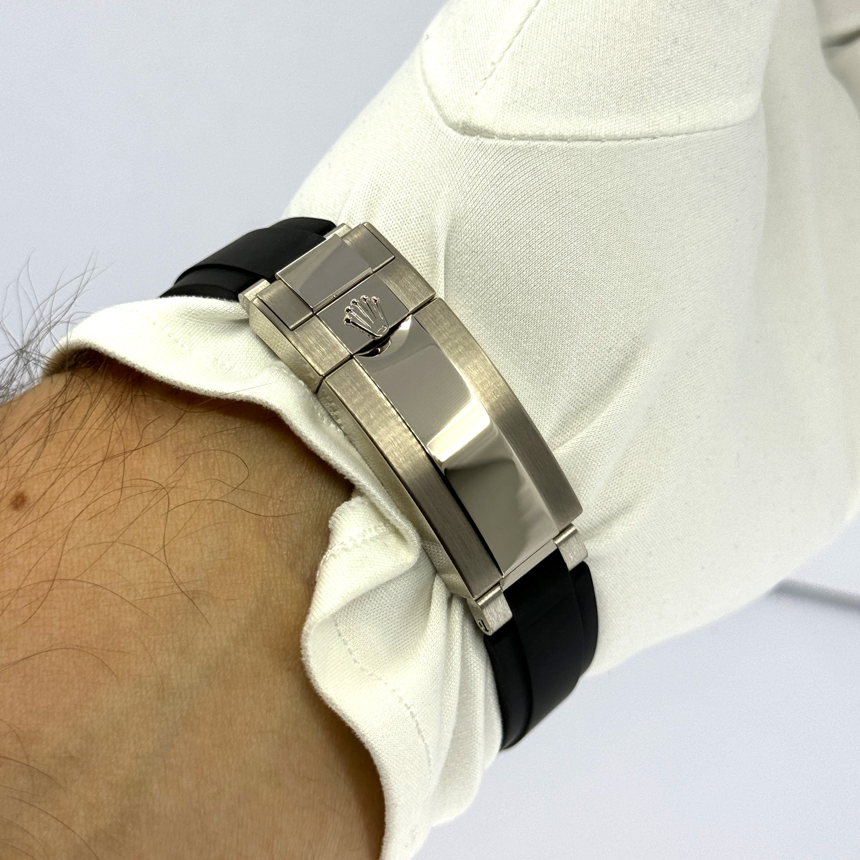 Unworn watch Rolex Cosmograph Daytona 40mm, 18k White Gold, Ref# 126519ln-0002. Born for motor racing, the watch combines sporty chic with versatility, making it a must-have for lovers of the fast lanes and the finest cars. The luxurious Rolex Cosmograph Daytona is synonymous with excellent workmanship, first-class technical features and unique looks. Proof of this is the stunning Bright Black dial and the crisply readable Chromalight display with a long blue glow. Spiral-shaped Steel counters complement it at 3, 6 and 9 o’clock, which record the hours, minutes and seconds from the start of the race. Stylish hour markers, sword-shaped hour and minute hands are filled with high-definition luminescent material. The elegant central seconds hand allows you to count time with an accuracy of 1/8 second. All details are made of 18k White Gold. A well-readable minute scale is applied along the outer contour of the dial. All this charm is complemented by a ribbed, for a comfortable grip, screw-down crown in 18k White Gold with the Rolex logo, which has a triple Triplock water-resistance system. At the 2 and 4 o’clock positions are the chronograph control buttons made of 18k White Gold. The dial is covered with a scratch-resistant sapphire crystal and a solid 18k White Gold case back. The Black monobloc Cerachrom bezel in high-tech ceramic is the highlight of the model. It is resistant to corrosion, practically does not scratch, is not affected by UV rays. Featuring an exceptionally clear tachymeter scale, thanks to a thin layer of platinum applied to the numerals and graduations using the PVD process, the bezel enhances the functionality of the watch. The model is equipped with a manufacture Rolex Self-winding mechanical movement Calibre 4131, contains 47 jewels and has an approximate power reserve approximately of 72 hours. This spectacular timepiece is presented on an Oysterflex bracelet. The 18k White Gold Folding Oysterlock safety clasp with Rolex Glidelock extension system comfort, made using own unique Rolex technologies, guarantees maximum comfort on the wrist. Water resistant up to 100m/330ft (10 ATM).