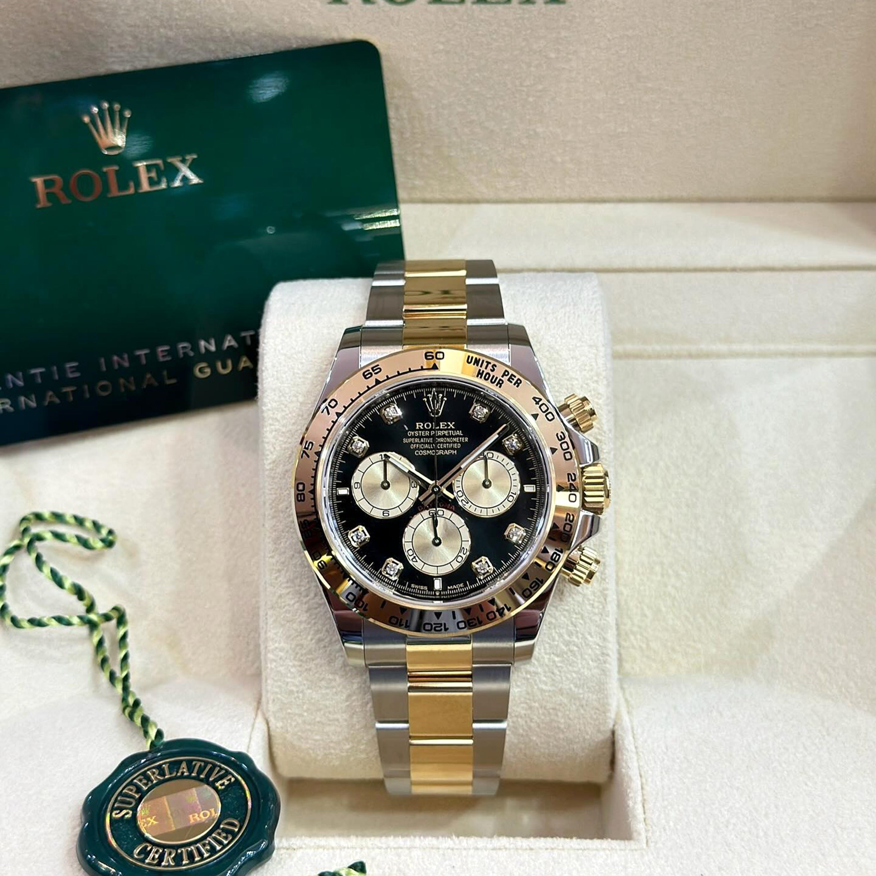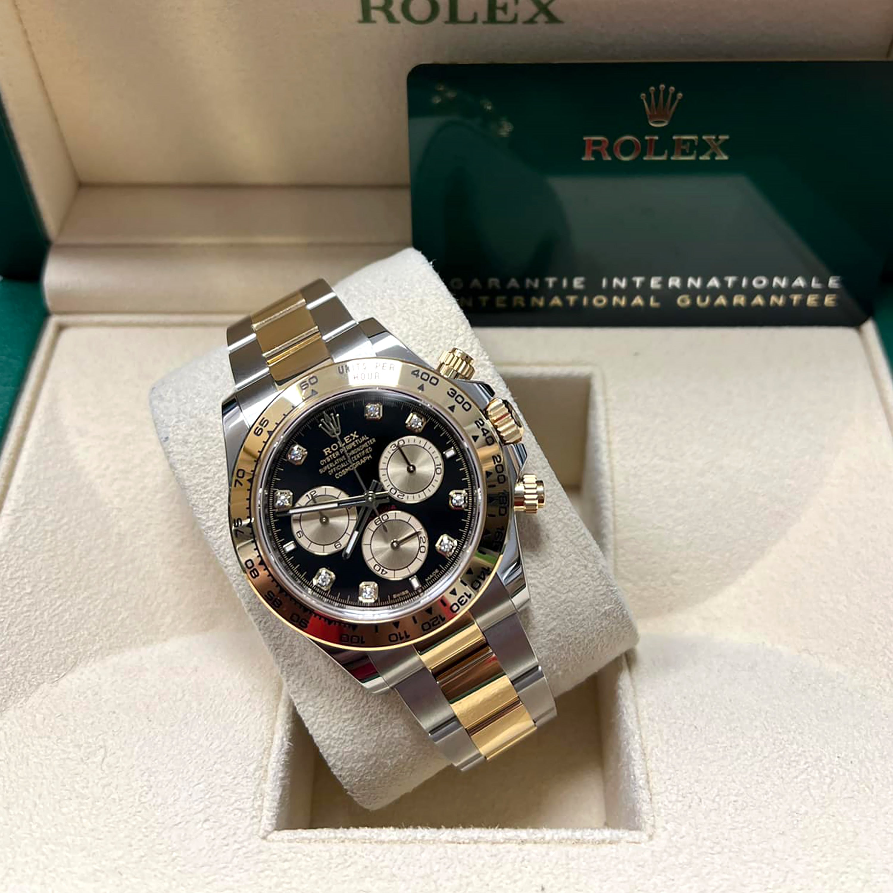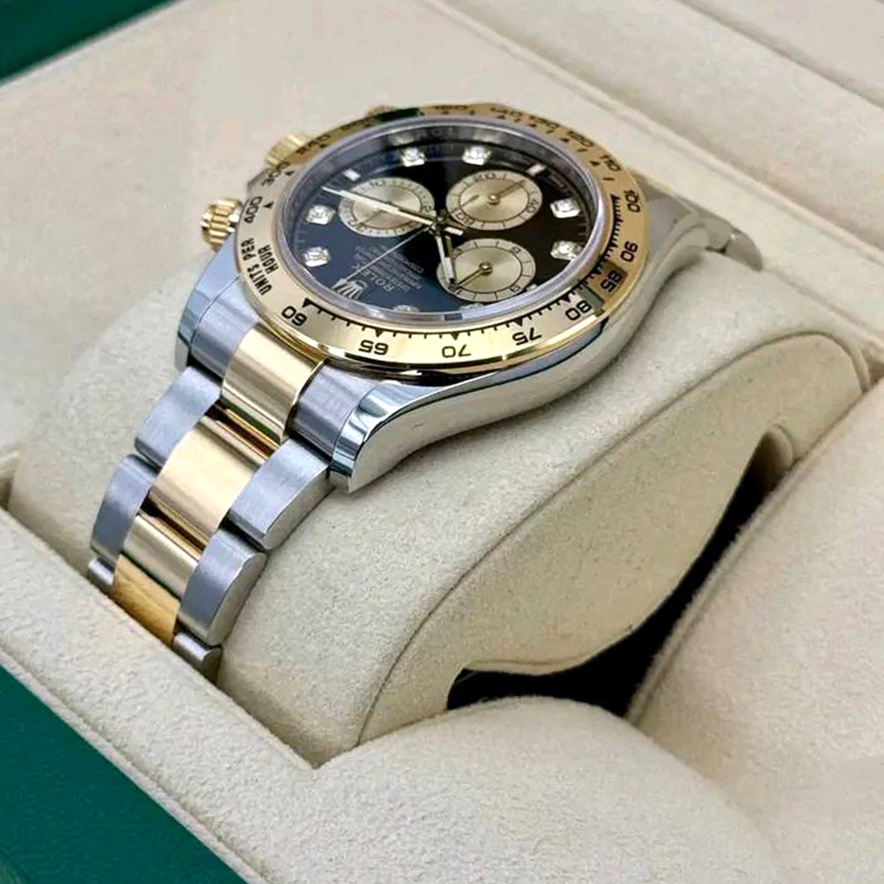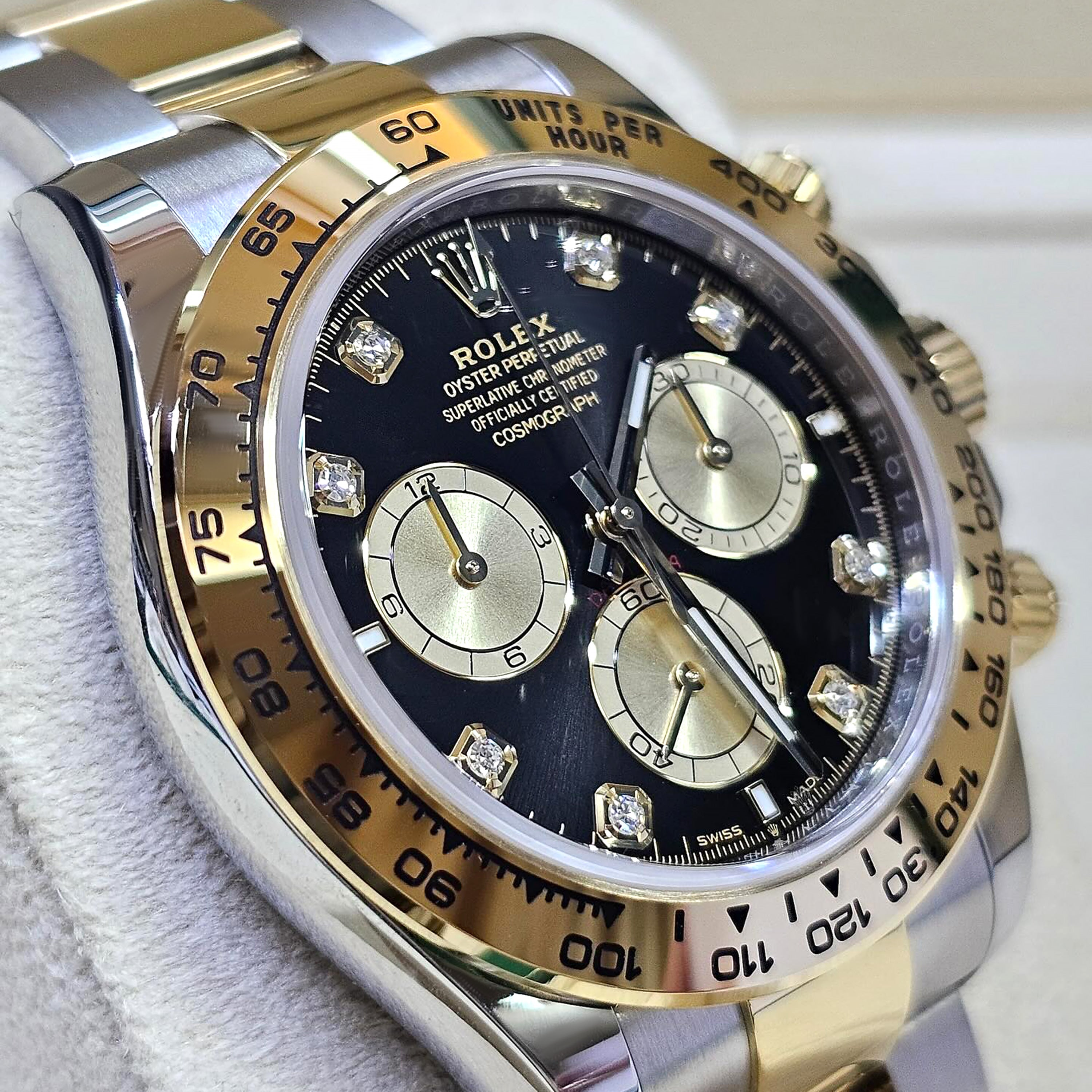 Unworn watch Rolex Cosmograph Daytona 40mm, Oystersteel and 18k Yellow Gold, Ref# 126503-0002. Born for motor racing, the watch combines sporty chic with versatility, making it a must-have for lovers of the fast lanes and the finest cars. The luxurious Rolex Cosmograph Daytona is synonymous with excellent workmanship, first-class technical features and unique looks. Proof of this is the stunning Bright black dial and the crisply readable Chromalight display with a long blue glow and stylish set with diamonds hour markers. Spiral-shaped Yellow counters complement it at 3, 6 and 9 o’clock, which record the hours, minutes and seconds from the start of the race. Elegant sword-shaped hour and minute hands are filled with high-definition luminescent material. The graceful central seconds hand allows you to count time with an accuracy of 1/8 second. All details are made of 18k Yellow gold. A well-readable minute scale is applied along the outer contour of the dial. All this charm is complemented by a ribbed, for a comfortable grip, screw-down crown in 18k Yellow Gold with the Rolex logo, which has a triple Triplock water-resistance system. At the 2 and 4 o’clock positions are the chronograph control buttons made of 18k Yellow Gold. The dial is covered with a scratch-resistant sapphire crystal and a solid Oystersteel case back. The Fixed 18k Yellow Gold monobloc bezel with engraved tachymetric scale enhances the functionality of the watch. The model is equipped with a manufacture Rolex Self-winding mechanical movement Calibre 4131, contains 47 jewels and has an approximate power reserve approximately of 72 hours. This spectacular timepiece is presented on an Oystersteel and 18k Yellow Gold Oyster, three-piece solid links bracelet. The Oystersteel and 18k Yellow Gold Folding Oysterlock safety clasp with Easylink 5 mm comfort extension link, made using own unique Rolex technologies, guarantees maximum comfort on the wrist. Water resistant up to 100m/330ft (10 ATM).